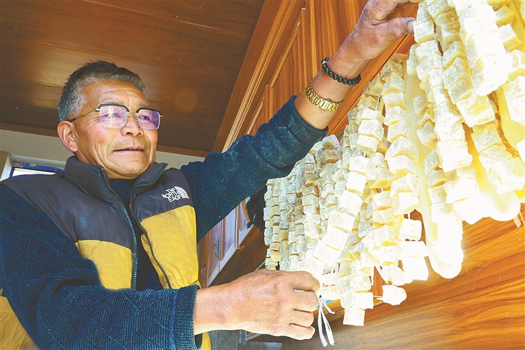 圖為墨竹工卡縣工卡鎮格桑村奶牛良種養殖戶擋桑晾曬奶渣。記者 黃志武 本報通訊員 洛克 攝