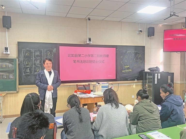 圖為侯華勝為比如縣第二小學(xué)第二期教師硬筆書法培訓(xùn)班結(jié)業(yè)寄語。