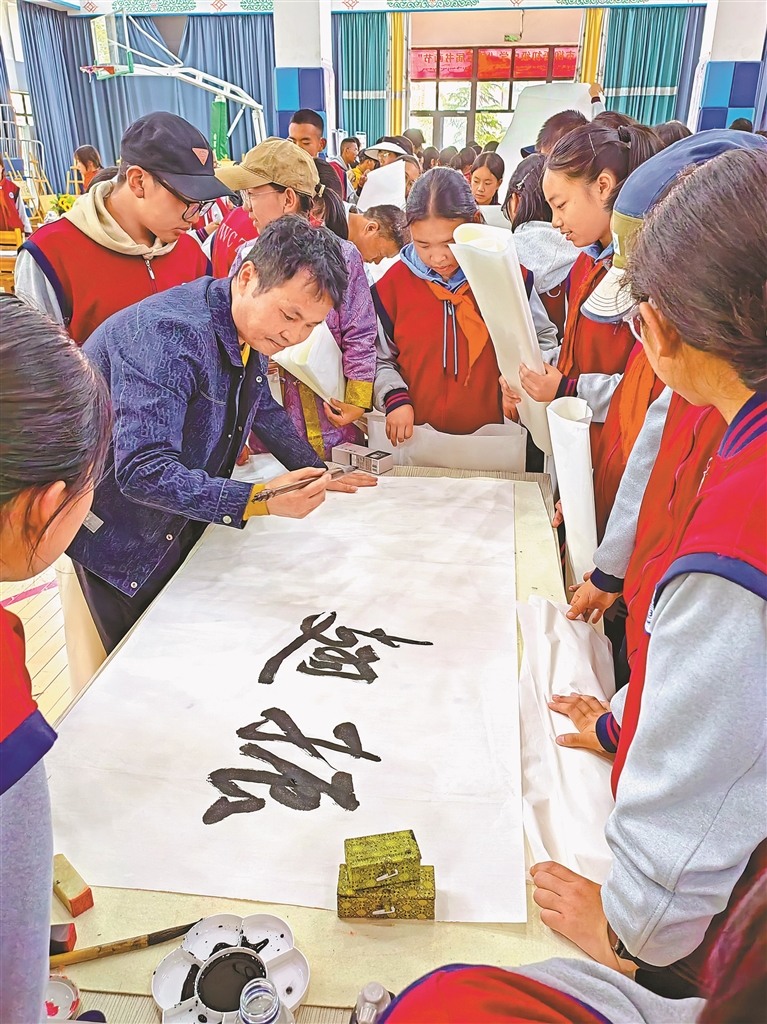他將這份對書法的深刻理解,毫無保留地傾注到教學(xué)中。他開始受邀在拉薩市實(shí)驗(yàn)小學(xué)、拉薩江蘇實(shí)驗(yàn)中學(xué)等多所學(xué)校舉辦公益講座與培訓(xùn),在與孩子們切磋交流的過程中,他不斷反思并完善自己的教學(xué)理念。