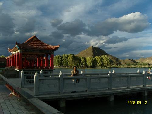 迎賓橋向東北通往拉薩,往正西結(jié)著迎賓路,是進(jìn)入市區(qū)的通道,寬廣明亮,橘黃色的燈光迎送著來往的賓客。迎賓路的末端就是十字路口,西和青島東路首尾相接,南北是年河路(吉林路)。沿著迎賓路往北剛剛落成了一個(gè)人工湖,湖心島、湖邊亭、高拱橋等分布在湖面上。