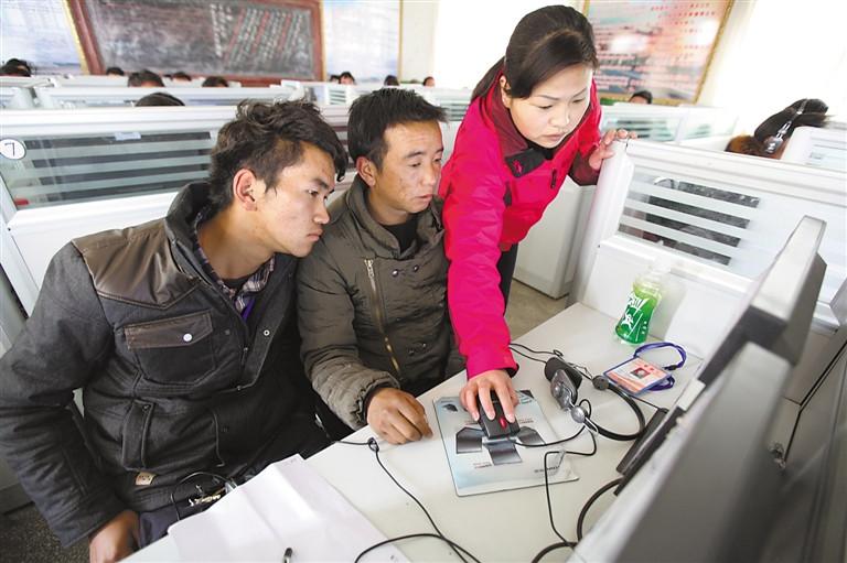 圖為山南市職業學校老師(右一)指導學生電腦操作。