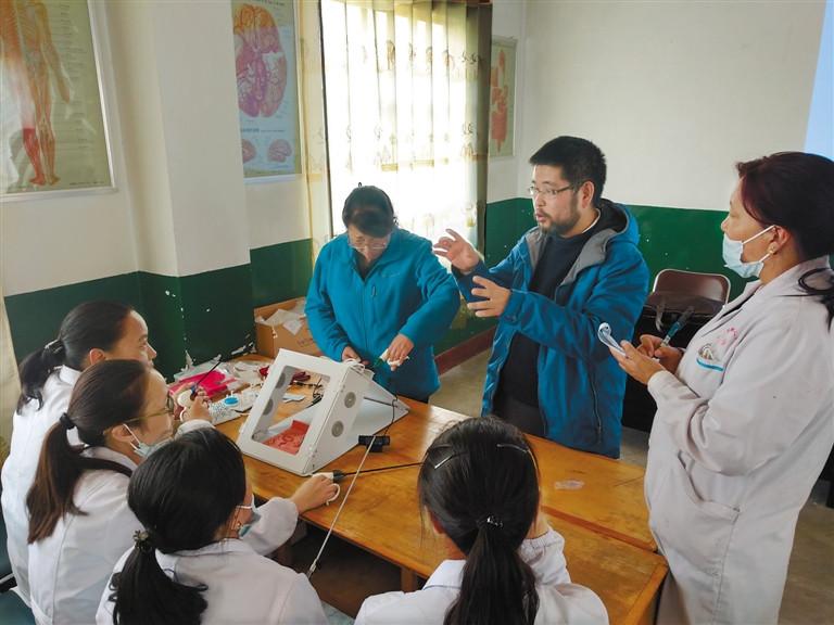 上海交通大學(xué)醫(yī)學(xué)院附屬仁濟醫(yī)院婦產(chǎn)科專家周潔如(右二)利用休息日,向日喀則市人民醫(yī)院醫(yī)生講解腹腔鏡技術(shù)。記者 孫開遠 攝