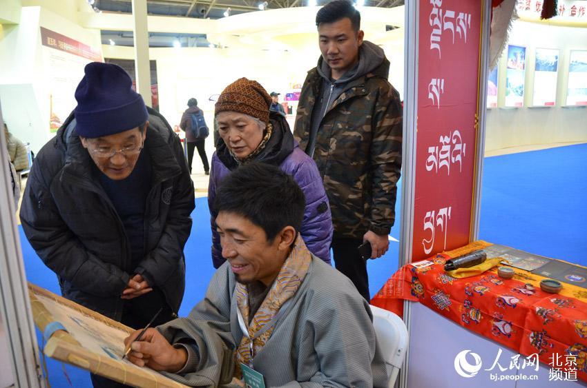 北京對口支援地區特色產品展銷會上,唐卡繪制吸引了市民的關注。人民網 尹星云 攝