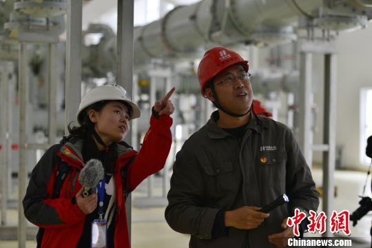 劉偉(右)在藏木水電站車間向來訪者講述發(fā)電流程。 周文元 攝