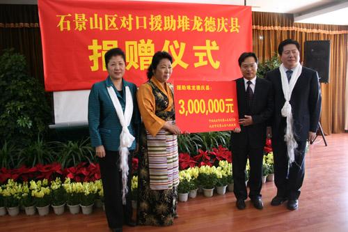 6月13日,由北京市石景山區區委書記榮華帶領的黨政代表團到對口支援的堆龍德慶縣考察,看望慰問援藏干部,并捐贈300萬元用于改善縣里的軟硬條件。北京市石景山區確定3年投入1050萬元援藏資金,扶持堆龍德慶縣農業項目、109國道旅游服務區和縣行政服務中心等重點項目。