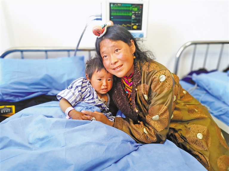 在福建省援藏工作隊(duì)的援助下,貧困家庭患兒獲得免費(fèi)救治。圖為母親在安撫術(shù)后的孩子。