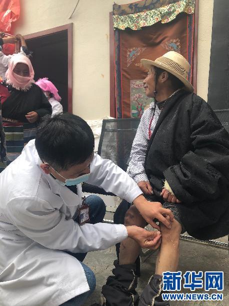 援藏醫生為貢布云旦針灸治腿。新華網發 (王宇翀攝)