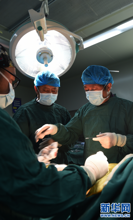 2017年5月26日,援藏醫生李家謀(右一)帶領拉薩市人民醫院的藏族醫生進行脊柱微創手術。新華社記者 覺果 攝