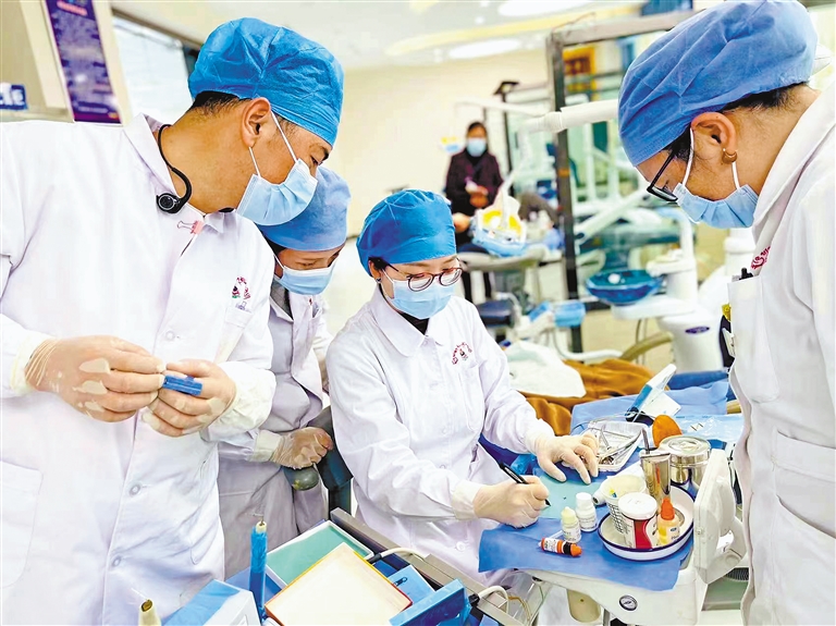 湖南援藏醫生、山南市藏醫醫院口腔科副主任醫師徐麗(中)圍繞橡皮障隔離術進行實操帶教。記者 劉楓 攝