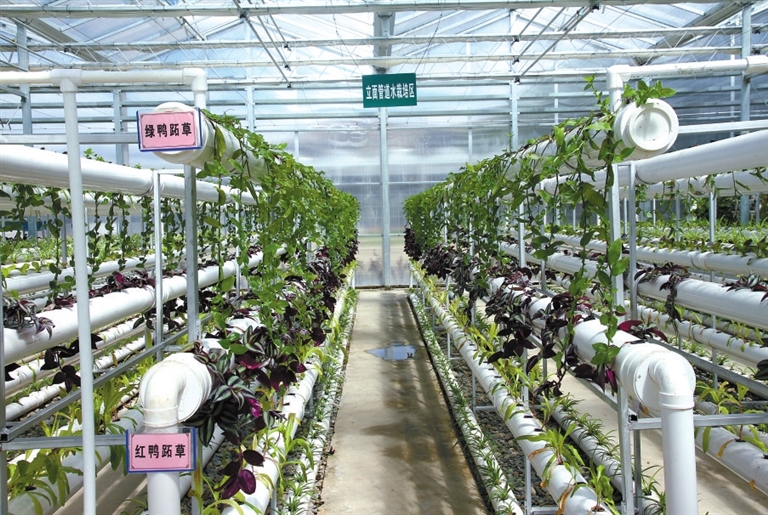 上海援建的江孜縣紅河谷農業科技示范園區內的立面管道水栽培區。