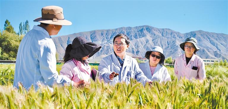 8月16日,山東援藏農業專家、日喀則市農牧業科學研究推廣中心副主任張斌(中)在青稞試驗田里指導種植。袁勇 攝(中經視覺)