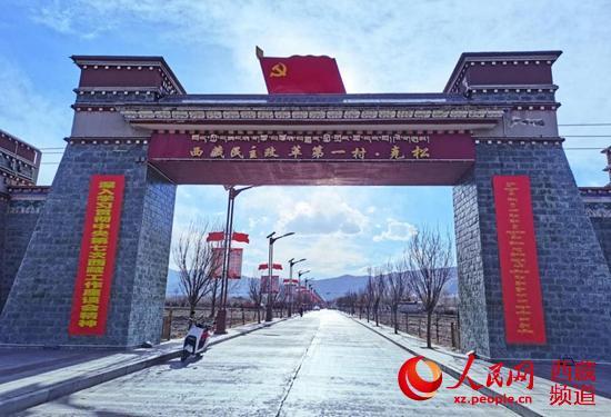 克松社區,距拉薩兩小時車程。遠遠地,人們就能看見村口的“西藏民主改革第一村·克松”幾個大字在陽光下熠熠生輝。