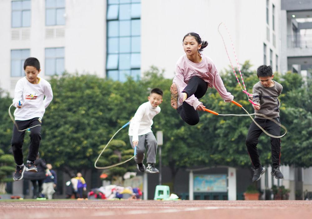 ↑重慶市九龍坡區(qū)西彭鎮(zhèn)第一小學(xué)校學(xué)生在體育課上進(jìn)行花樣跳繩訓(xùn)練(2020年12月9日攝)。