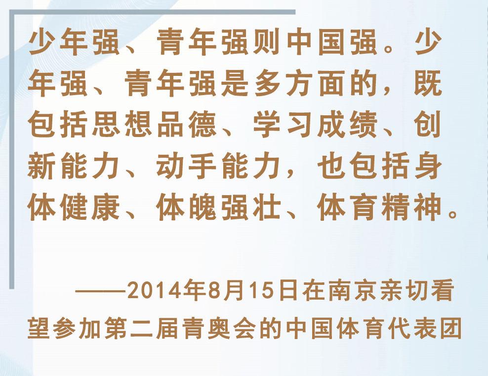 青少年是祖國的未來、民族的希望。強(qiáng)健的體魄是青少年成長成才的重要前提。對(duì)加強(qiáng)體育教育,增強(qiáng)青少年體質(zhì),習(xí)近平總書記念茲在茲。