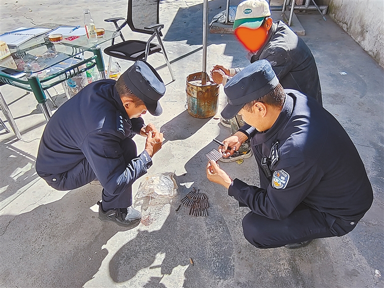 圖為加查縣安繞鎮派出所民警現場檢查洛某上交的子彈。記者 彭琦 見習記者 武沛濤 攝
