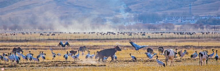 “穩(wěn)定的夜宿環(huán)境、大面積的傳統(tǒng)農(nóng)田、和諧的人鳥(niǎo)關(guān)系和較好的生態(tài)保護(hù)基礎(chǔ),是林周縣成為大批候鳥(niǎo)棲息地的主要原因?!弊灾螀^(qū)高原生物研究所副所長(zhǎng)楊樂(lè)給出答案。