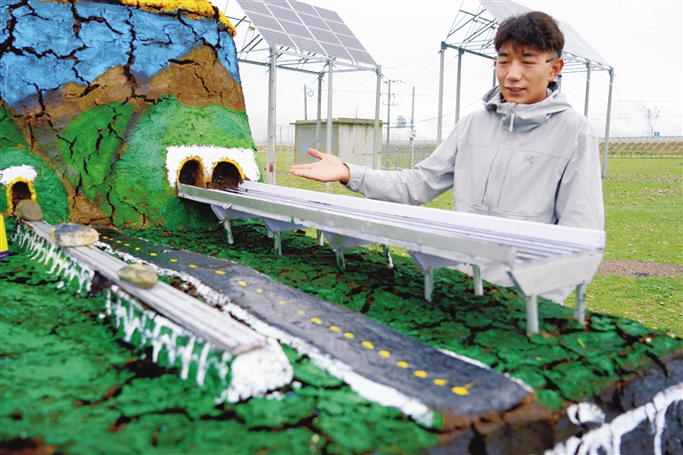 色尼區古露鎮薩措村村民平措創作的橫穿該鎮的青藏鐵路、青藏公路、那拉高速的“牛糞藝術墻”。記者 萬靖 攝