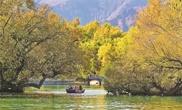 深秋的拉薩市宗角祿康公園,樹葉褪去翠綠,換上金黃與橙紅的盛裝,倒映在澄澈湖水中,與小橋、游船構(gòu)成一幅美麗的秋景圖,吸引眾多市民、游客前往。