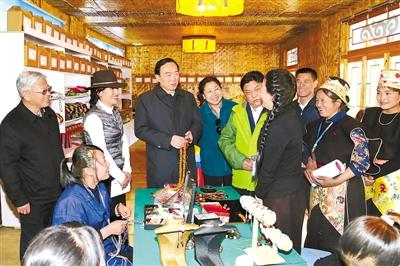 在林芝市巴宜區八一鎮色定村的阿吉林農牧民專業合作社,陳全國、白瑪赤林參觀產品展示區和手工作坊區,并與社員們親切交談。(記者 姚海全 攝)