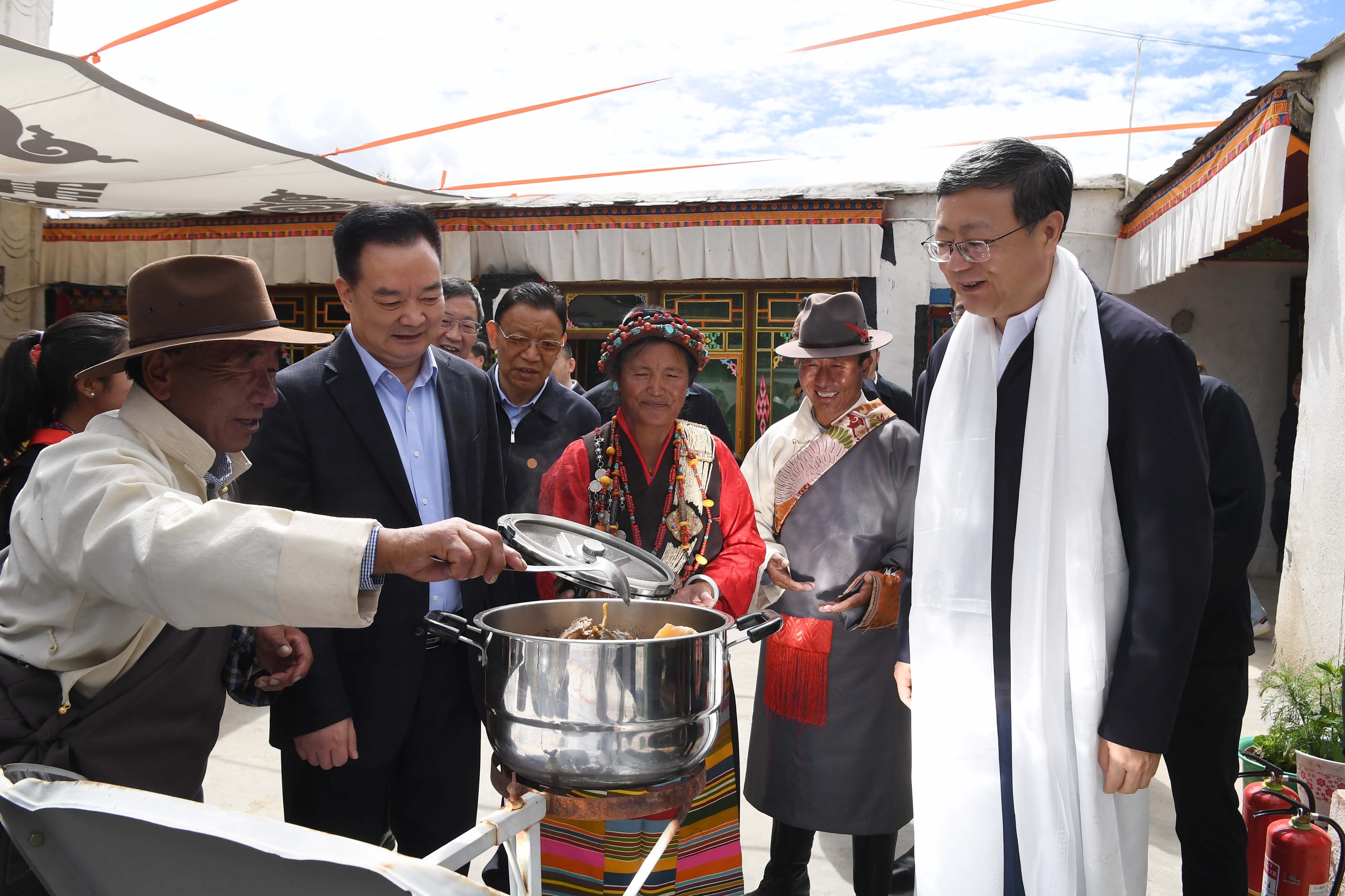 7月17至18日,上海市代表團來藏考察并舉行上海·西藏工作座談會。這是上海市委書記陳吉寧和西藏自治區黨委書記王君正在日喀則市江孜縣年堆鄉索蓋村米瑪瓊達家了解高原新型炊具使用情況。記者 李洲 攝