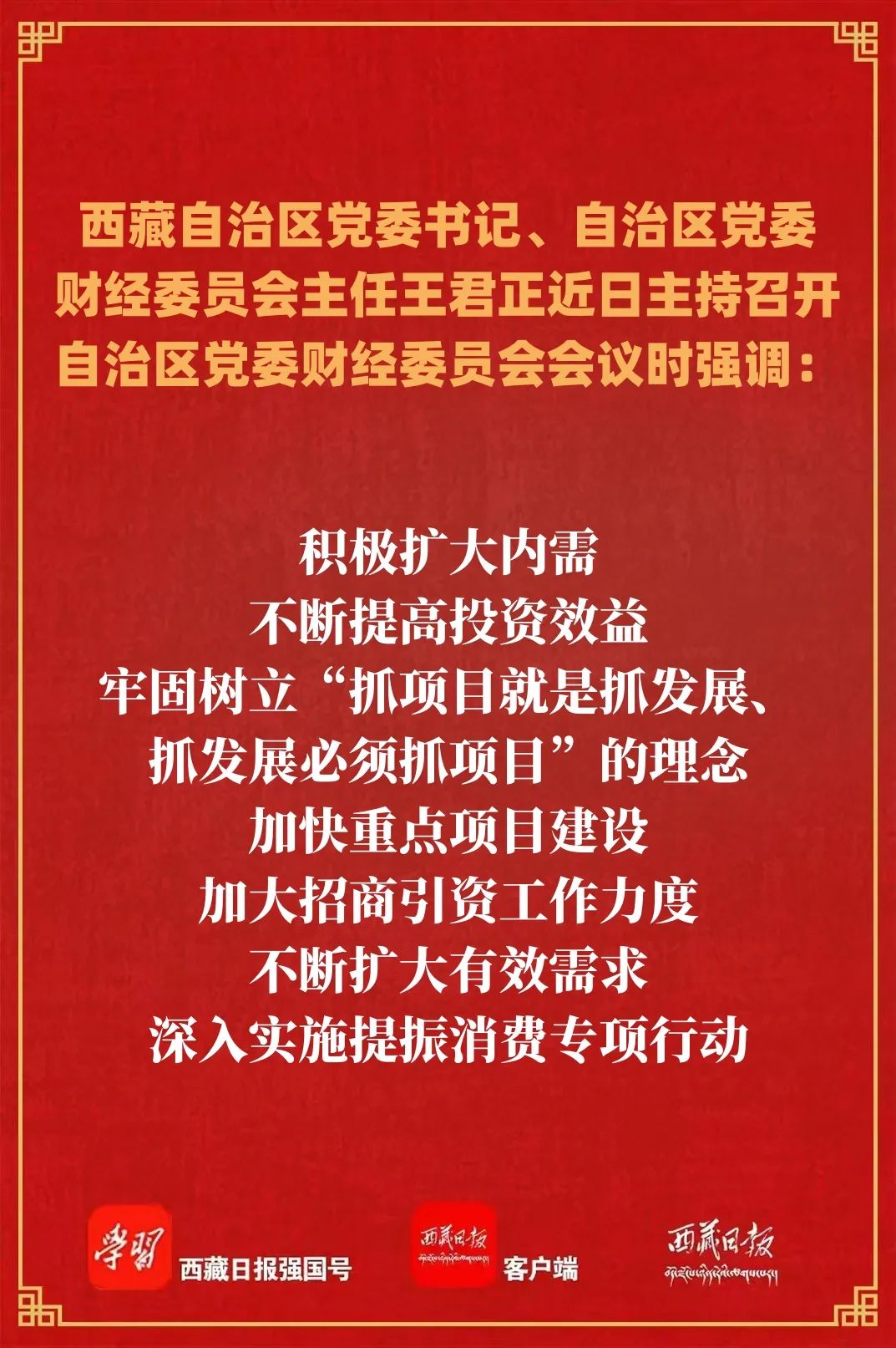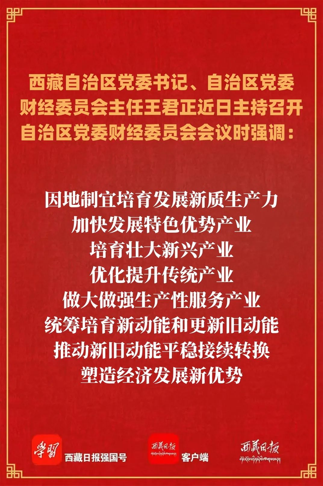 近日,自治區黨委書記、自治區黨委財經委員會主任王君正主持召開自治區黨委財經委員會會議,認真傳達學習中央經濟工作會議、自治區黨委十屆七次全會暨自治區黨委經濟工作會議精神,總結2024年我區財經工作,研究部署2025年重點任務。強調,要堅持以習近平經濟思想統攬西藏經濟社會發展全局,完整準確全面貫徹新發展理念,努力推動西藏經濟高質量發展。