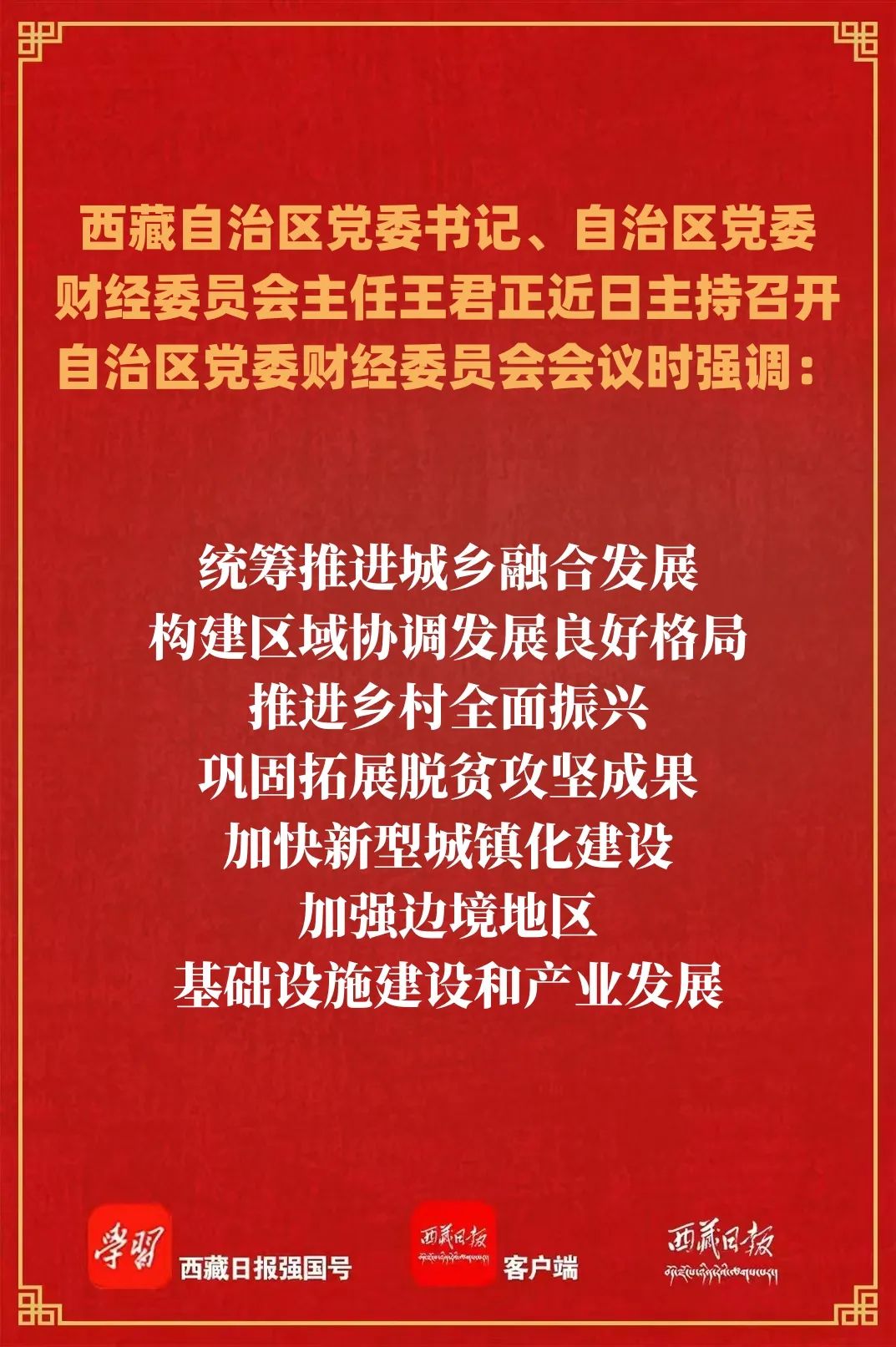 王君正強調,今年是“十四五”規劃收官之年,也是自治區成立60周年。全區各級各部門要堅持用習近平經濟思想統攬西藏高質量發展全局,切實增強做好財經工作的思想自覺、政治自覺和行動自覺,完整準確全面貫徹新發展理念,聚焦“四件大事”聚力“四個創建”,緊盯今年經濟工作的總體要求和目標任務,堅持穩中求進、以進促穩,守正創新、先立后破,系統集成、協同配合,確保各項重點任務順利完成,為實現“十五五”良好開局打好基礎。