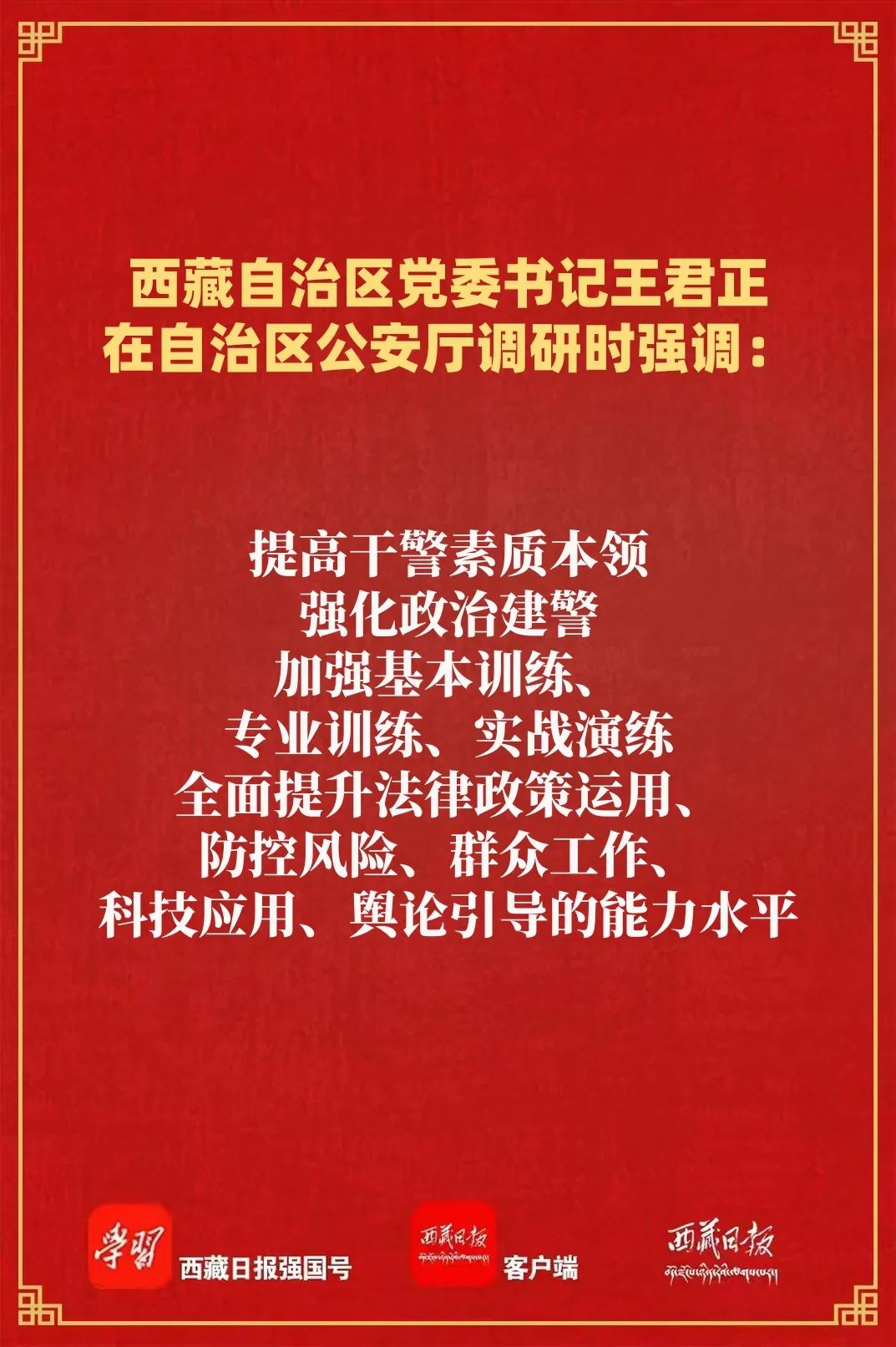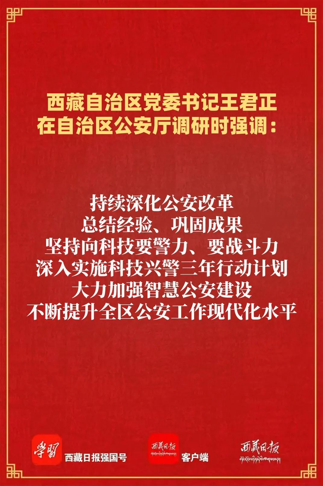 王君正強調,要緊緊圍繞全區經濟社會發展大局,依法履行職責使命,為社會主義現代化新西藏建設提供堅強安全保障。聚焦維護社會穩定和長治久安,不斷提高社會治理體系和治理能力現代化水平,樹牢總體國家安全觀,堅持警鐘長鳴、警惕常在,以科學化機制和常態化、法治化理念,把公安工作做在日常、做到經常、落實在基層;牢牢掌握反分裂斗爭主動權,持續深化公共安全治理,完善防范化解重大風險隱患機制,提高預測預警預防各類風險能力,努力營造安全穩定的社會環境。聚焦服務高質量發展,完整準確全面貫徹新發展理念,堅持“三個賦予一個有利于”總要求,堅持一切從實際出發,更好統籌發展和安全、開放和安全,持續優化法治化營商環境;樹立大抓基層鮮明導向,扎實做好基層基礎工作,把群眾身邊的小事當作各級公安機關的大事來抓,既用好科學技術,又發揮好基層主觀能動性和創造性,真正把好事辦好、實事辦實,不斷增強各族群眾的獲得感幸福感安全感。聚焦筑牢國家生態安全屏障,嚴格落實青藏高原生態保護法,嚴守生態保護紅線,支持生態環境保護和綠色發展,依法嚴厲打擊各類破壞生態環境和危害生物安全的犯罪活動,扎實推進美麗西藏建設。聚焦強邊富民,健全黨政軍警民合力強邊固防機制,提升智慧邊防建設水平,著力構筑維護國家安全的鋼鐵長城。持續深化公安改革,總結經驗、鞏固成果,堅持向科技要警力、要戰斗力,深入實施科技興警三年行動計劃,大力加強智慧公安建設,不斷提升全區公安工作現代化水平。
