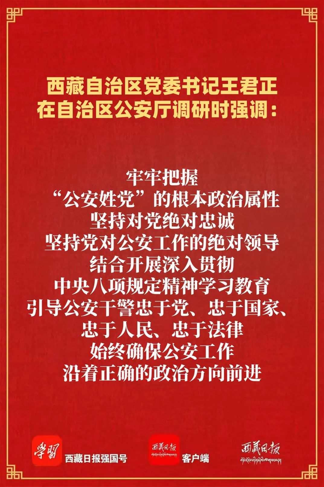 王君正強調,全區各級公安機關要堅持用習近平新時代中國特色社會主義思想統攬西藏公安工作全局,深刻領悟蘊含其中的科學世界觀和方法論,自覺用以武裝頭腦、指導實踐、推動工作,牢牢把握“公安姓黨”的根本政治屬性,堅持對黨絕對忠誠,堅持黨對公安工作的絕對領導,結合開展深入貫徹中央八項規定精神學習教育,引導公安干警忠于黨、忠于國家、忠于人民、忠于法律,始終確保公安工作沿著正確的政治方向前進。