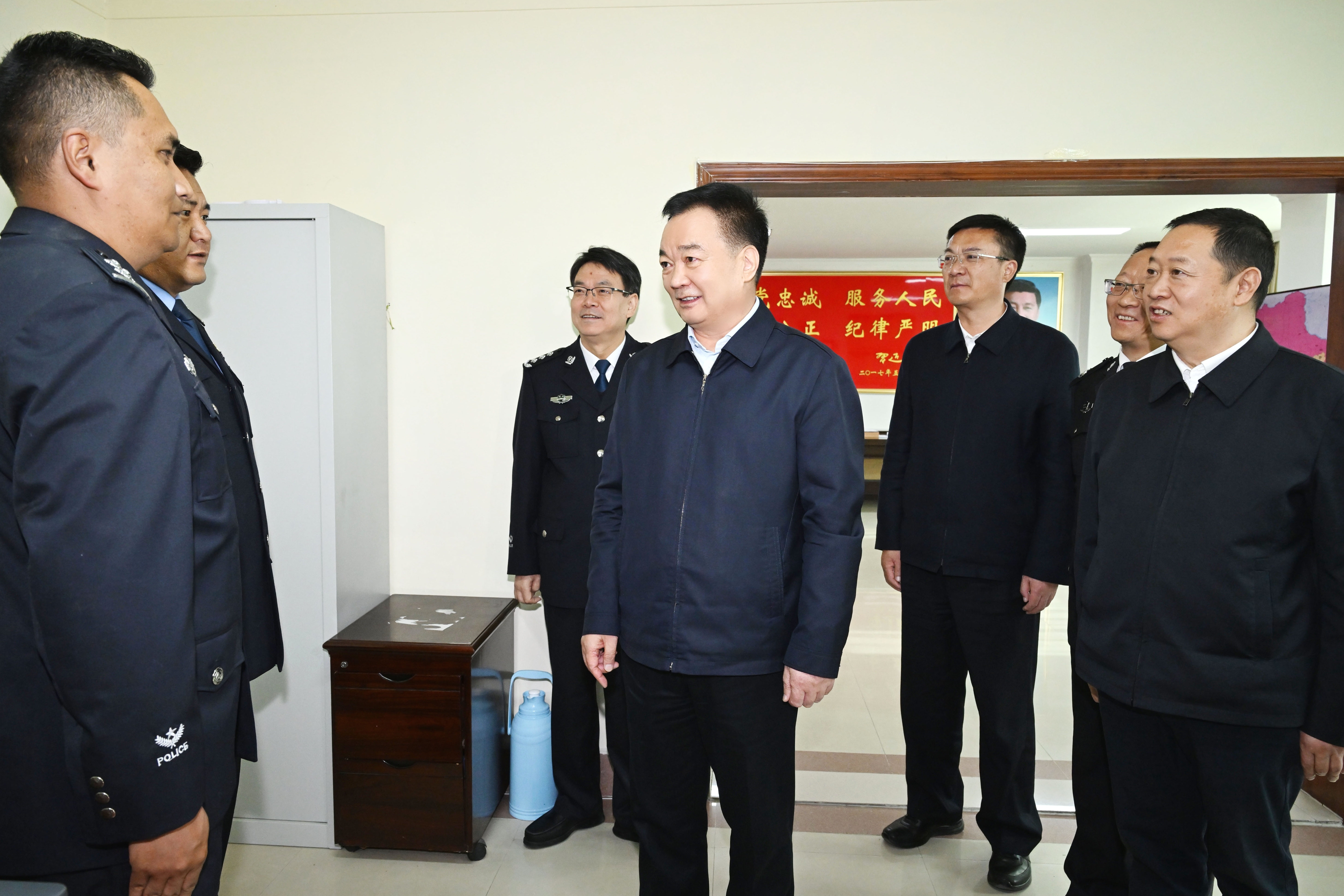王君正強調,要以黨的政治建設為統領,加強領導班子建設,堅持對黨忠誠、服務人民、執法公正、紀律嚴明,領導干部要站得高、看得遠、想得深、說得明,帶頭筑牢政治忠誠、加強理論武裝、樹立正確政績觀、執行民主集中制、改進作風狠抓落實、踐行“六個表率”,不斷開創全區公安工作新局面。提高干警素質本領,強化政治建警,加強基本訓練、專業訓練、實戰演練,全面提升法律政策運用、防控風險、群眾工作、科技應用、輿論引導的能力水平。堅持從嚴治警和從優待警相結合,嚴管厚愛結合、激勵約束并重,嚴格落實全面從嚴管黨治警要求,憑能力用干部、以實績論英雄,加大干部培養使用力度,深化正風肅紀反腐,落實從優待警各項措施,關心關愛干警學習工作生活,把愛警暖警工作做到干警心坎上,發揮典型引路作用,發現典型、培育典型、宣傳典型,不斷增強廣大公安干警的獲得感榮譽感,鍛造忠誠干凈擔當的高素質公安隊伍,努力為社會主義現代化新西藏建設作出更大貢獻。