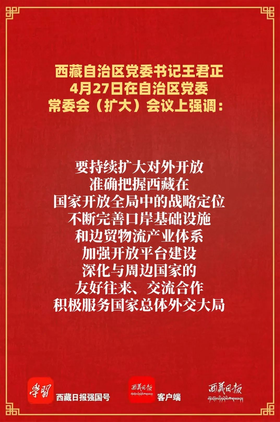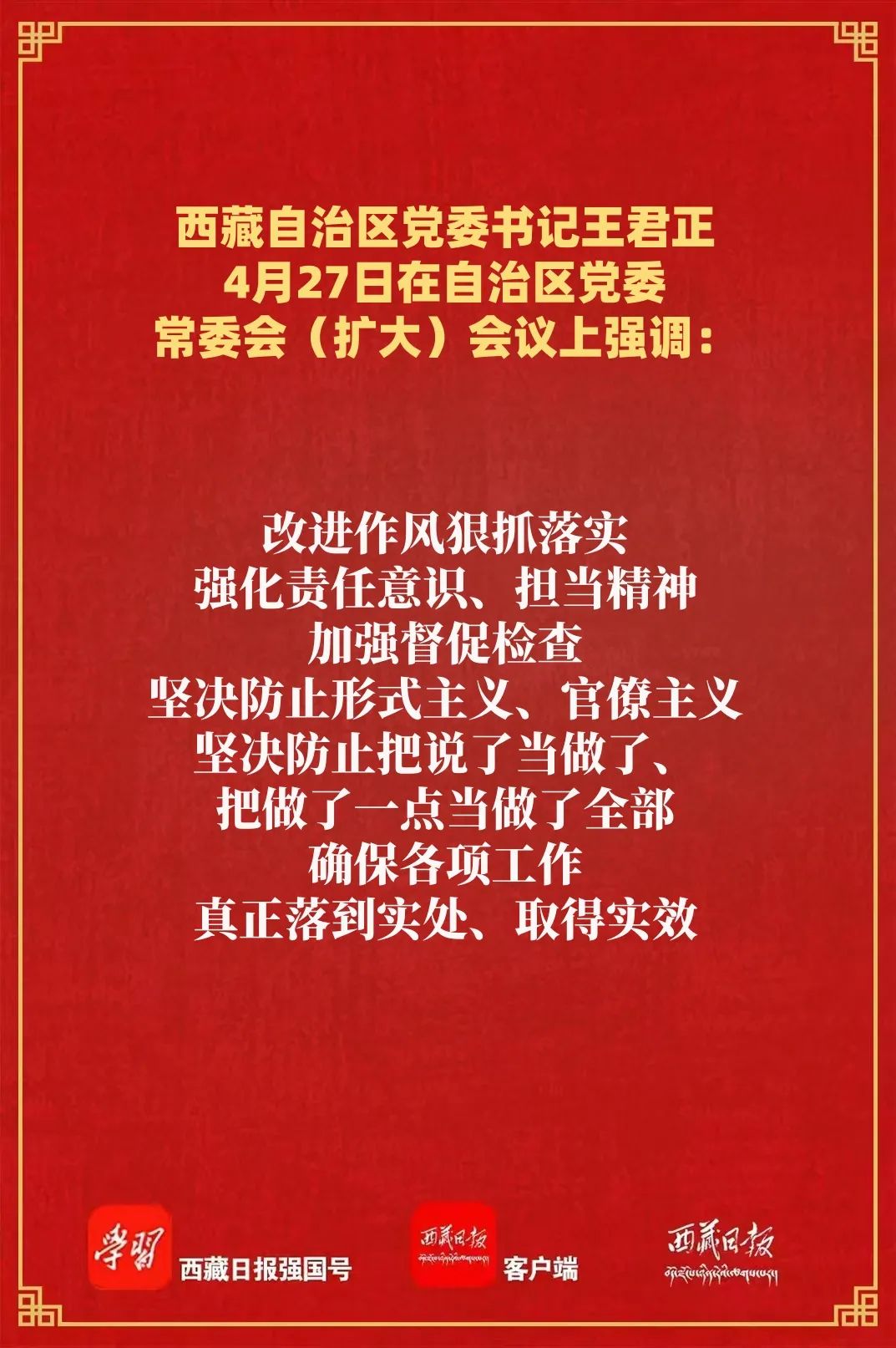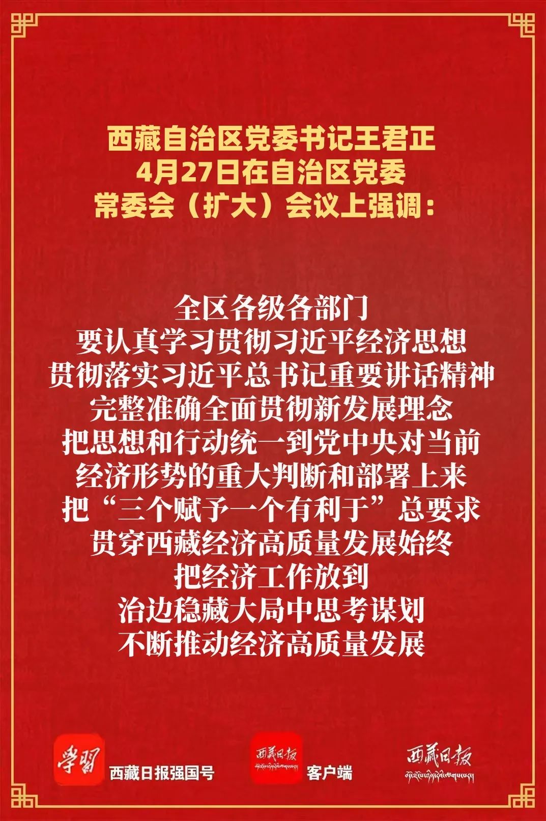 4月27日,自治區(qū)黨委書記王君正主持召開自治區(qū)黨委常委會(huì)(擴(kuò)大)會(huì)議,認(rèn)真?zhèn)鬟_(dá)學(xué)習(xí)習(xí)近平總書記近期重要講話重要指示精神,聽取2025年一季度全區(qū)經(jīng)濟(jì)運(yùn)行形勢(shì)分析,研究部署下一階段經(jīng)濟(jì)工作。強(qiáng)調(diào),要深入學(xué)習(xí)貫徹習(xí)近平經(jīng)濟(jì)思想,完整準(zhǔn)確全面貫徹新發(fā)展理念,科學(xué)研判形勢(shì),堅(jiān)定發(fā)展信心,不斷增強(qiáng)責(zé)任感使命感,努力推動(dòng)西藏經(jīng)濟(jì)高質(zhì)量發(fā)展。