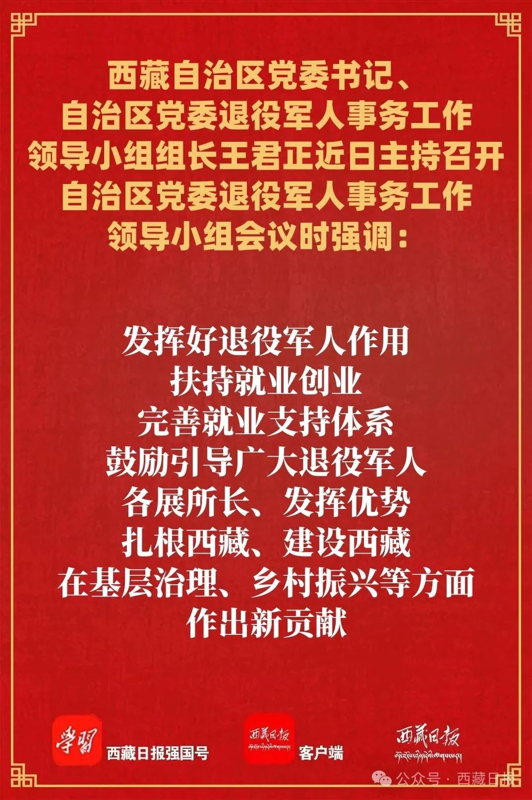 近日,自治區黨委書記、自治區黨委退役軍人事務工作領導小組組長王君正主持召開自治區黨委退役軍人事務工作領導小組會議。他強調,要深入貫徹落實習近平總書記關于退役軍人工作、雙擁工作的重要指示精神,弘揚優良傳統,強化服務保障,努力提升退役軍人工作質效,為西藏長治久安和高質量發展作出積極貢獻。