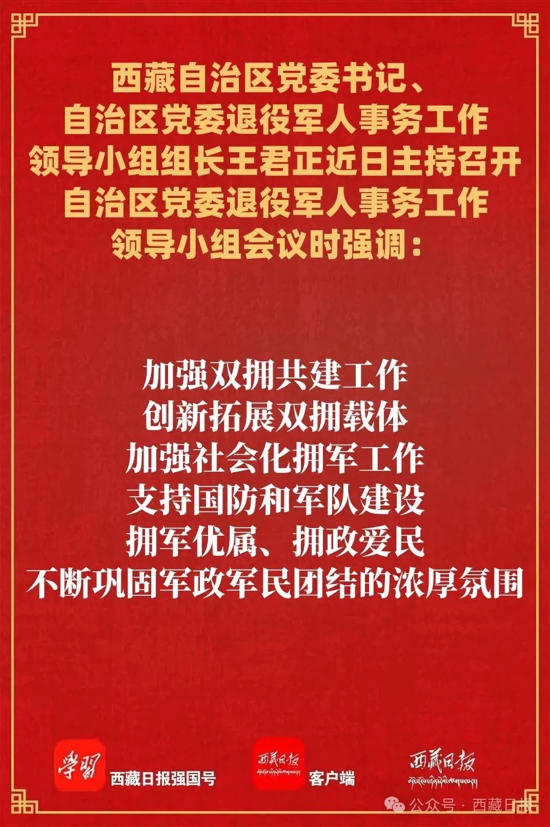 王君正強調,要加強組織領導,改進作風狠抓落實,確保退役軍人工作部署落到實處、見到實效。嚴格落實工作責任,各級黨委要認真履行主體責任,各成員單位要分工負責、密切配合,形成齊抓共管的工作格局。持續改進工作作風,認真開展深入貫徹中央八項規定精神學習教育,對各項任務清單化管理、項目化落實、工程化推進,力戒形式主義、官僚主義。加強退役軍人工作隊伍建設,憑能力用干部、以實績論英雄,著力打造一支政治堅定、業務精湛、作風過硬的高素質專業化干部隊伍。大力弘揚光榮傳統和優良作風,堅持典型引路,積極宣傳退役軍人先進事跡,營造良好社會氛圍,引導各族群眾傳承紅色基因、賡續紅色血脈,為社會主義現代化新西藏建設凝聚力量。