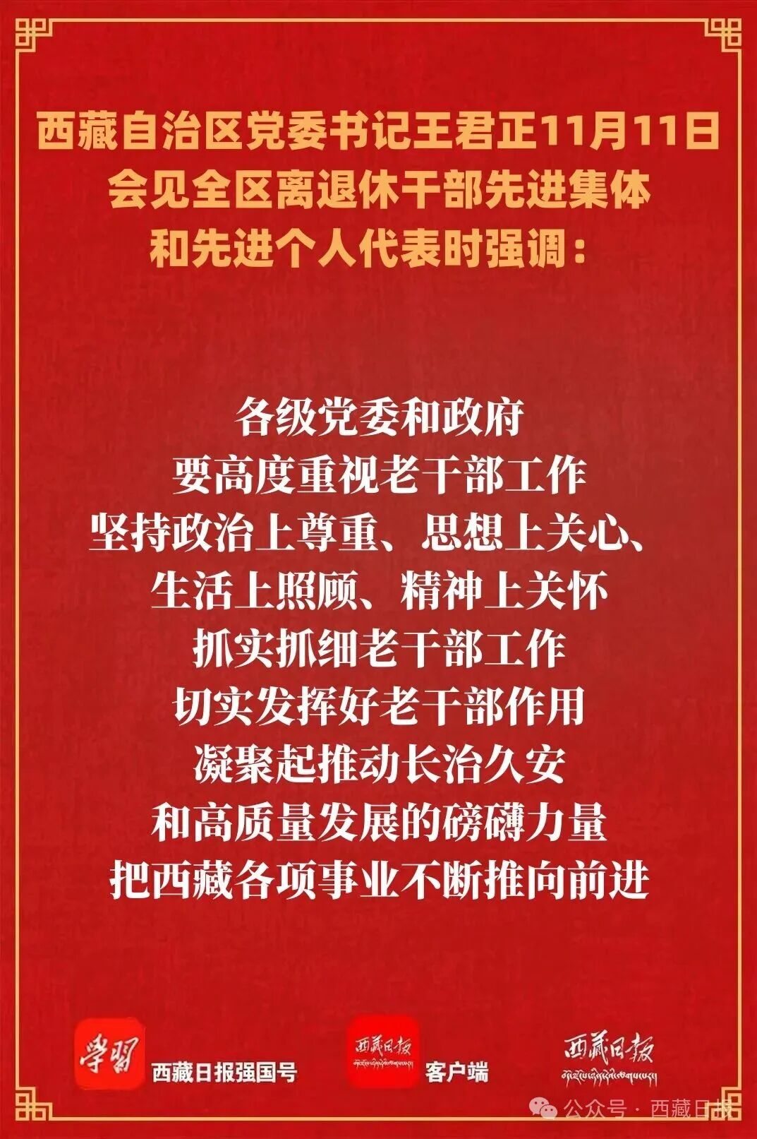 王君正強調,老干部是黨和國家的寶貴財富。各級黨委和政府要高度重視老干部工作,堅持政治上尊重、思想上關心、生活上照顧、精神上關懷,抓實抓細老干部工作,切實發揮好老干部作用,凝聚起推動長治久安和高質量發展的磅礴力量,把西藏各項事業不斷推向前進。