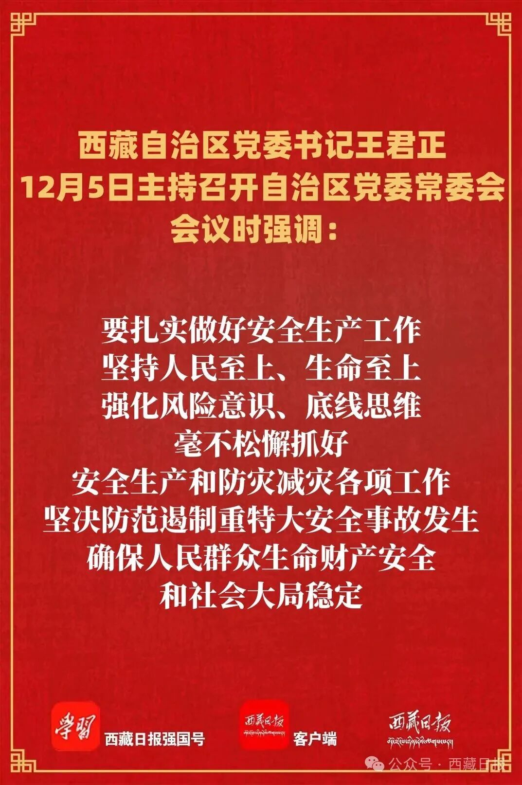 會(huì)議傳達(dá)學(xué)習(xí)了習(xí)近平總書記對(duì)香港新界大埔區(qū)住宅樓重大火災(zāi)事故作出的重要指示精神。王君正強(qiáng)調(diào),要扎實(shí)做好安全生產(chǎn)工作,堅(jiān)持人民至上、生命至上,強(qiáng)化風(fēng)險(xiǎn)意識(shí)、底線思維,毫不松懈抓好安全生產(chǎn)和防災(zāi)減災(zāi)各項(xiàng)工作,堅(jiān)決防范遏制重特大安全事故發(fā)生,確保人民群眾生命財(cái)產(chǎn)安全和社會(huì)大局穩(wěn)定。壓緊壓實(shí)安全生產(chǎn)責(zé)任制,以“時(shí)時(shí)放心不下”的責(zé)任感,健全安全風(fēng)險(xiǎn)監(jiān)測(cè)預(yù)警體系,完善應(yīng)急管理工作機(jī)制,廣泛普及安全知識(shí),強(qiáng)化安全提醒和教育,織密扎牢安全防護(hù)網(wǎng)。全面加強(qiáng)消防安全管理,圍繞排查重點(diǎn)任務(wù),扎實(shí)開展重大火災(zāi)風(fēng)險(xiǎn)隱患排查整治行動(dòng),發(fā)現(xiàn)問(wèn)題及時(shí)整改到位,努力把風(fēng)險(xiǎn)隱患消除在萌芽狀態(tài)。堅(jiān)持舉一反三,從西藏實(shí)際出發(fā),加強(qiáng)森林草原防火、雨雪冰凍災(zāi)害、道路交通等重點(diǎn)領(lǐng)域監(jiān)管,充分動(dòng)員群防群治力量開展風(fēng)險(xiǎn)隱患排查整治,堅(jiān)決守牢安全底線,建設(shè)更高水平的平安西藏。