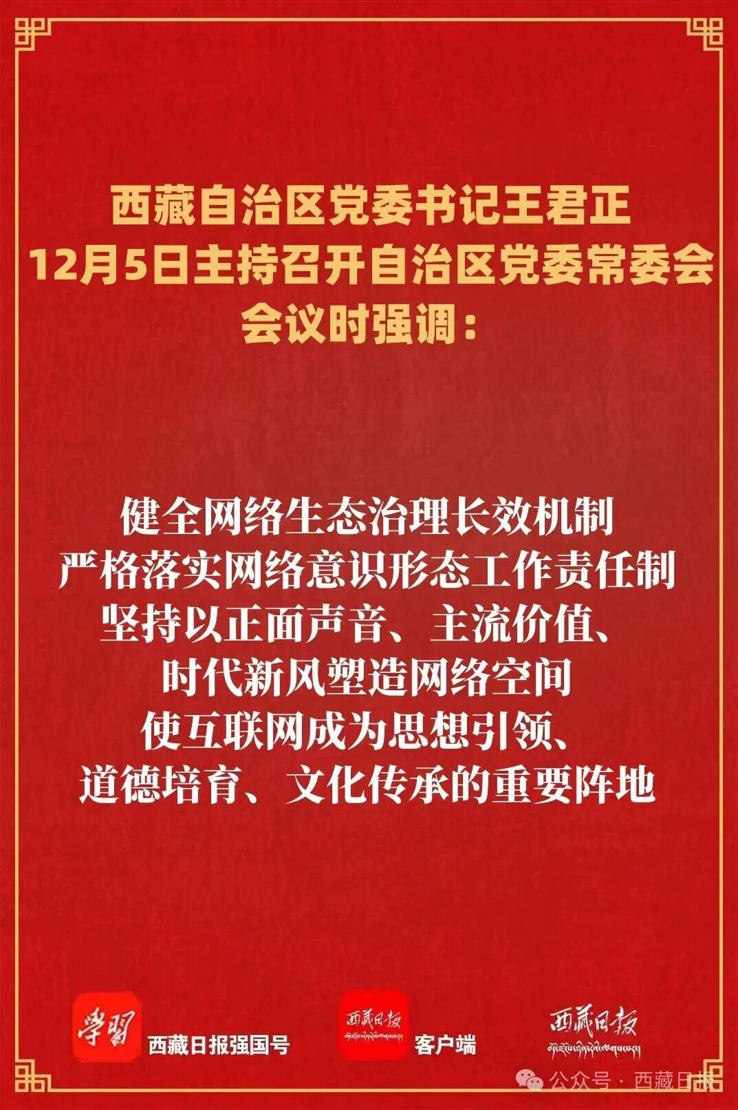 王君正強(qiáng)調(diào),要堅(jiān)持理論聯(lián)系實(shí)際的學(xué)風(fēng),努力把學(xué)習(xí)成果轉(zhuǎn)化為建設(shè)社會(huì)主義現(xiàn)代化新西藏的強(qiáng)大動(dòng)力。傳承紅色基因、賡續(xù)紅色血脈,廣泛開展革命傳統(tǒng)教育,大力弘揚(yáng)偉大建黨精神和“兩路”精神、老西藏精神、孔繁森精神,堅(jiān)定理想信念,厚植為民情懷,切實(shí)把對(duì)老一輩革命家的懷念和敬仰之情,轉(zhuǎn)化為干事創(chuàng)業(yè)的強(qiáng)大動(dòng)力和實(shí)際成效。健全網(wǎng)絡(luò)生態(tài)治理長(zhǎng)效機(jī)制,嚴(yán)格落實(shí)網(wǎng)絡(luò)意識(shí)形態(tài)工作責(zé)任制,堅(jiān)持以正面聲音、主流價(jià)值、時(shí)代新風(fēng)塑造網(wǎng)絡(luò)空間,使互聯(lián)網(wǎng)成為思想引領(lǐng)、道德培育、文化傳承的重要陣地;依法加強(qiáng)網(wǎng)絡(luò)空間治理,強(qiáng)化源頭治理、綜合施治,持續(xù)開展清朗、凈網(wǎng)等專項(xiàng)行動(dòng),營(yíng)造風(fēng)清氣正的網(wǎng)絡(luò)空間。積極服務(wù)國(guó)家總體外交大局,持續(xù)完善口岸基礎(chǔ)設(shè)施和邊貿(mào)物流產(chǎn)業(yè)體系,加強(qiáng)開放平臺(tái)建設(shè),深化與周邊國(guó)家友好往來(lái)、務(wù)實(shí)合作,更好融入共建“一帶一路”;不斷提升國(guó)際傳播能力,講好新時(shí)代西藏故事,讓世界更好了解西藏,讓西藏更快走向世界。推動(dòng)清潔能源高質(zhì)量發(fā)展,立足資源稟賦和區(qū)位特點(diǎn),全面推進(jìn)能源全鏈條產(chǎn)業(yè)布局,推動(dòng)水風(fēng)光一體化協(xié)同發(fā)展,加快建設(shè)電力外送通道,不斷探索能源合作新模式,努力把資源優(yōu)勢(shì)轉(zhuǎn)化為經(jīng)濟(jì)優(yōu)勢(shì)、發(fā)展優(yōu)勢(shì)。健全志愿服務(wù)體系,大力弘揚(yáng)志愿精神,豐富志愿服務(wù)內(nèi)容,培樹志愿服務(wù)品牌,鼓勵(lì)引導(dǎo)志愿服務(wù)組織和志愿者積極參與社會(huì)主義現(xiàn)代化新西藏建設(shè),構(gòu)建起多部門聯(lián)動(dòng)、多行業(yè)參與的新時(shí)代志愿服務(wù)格局。