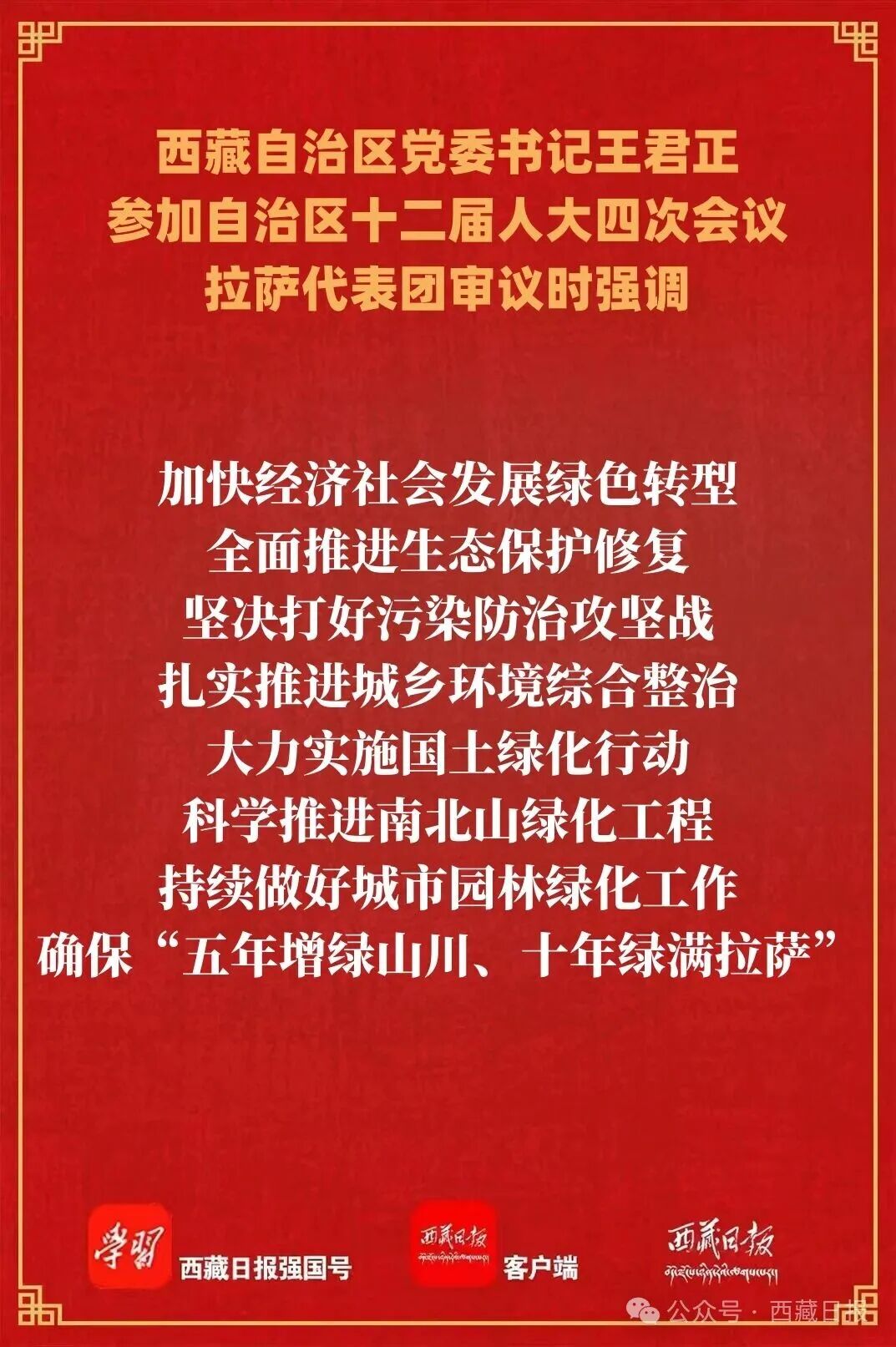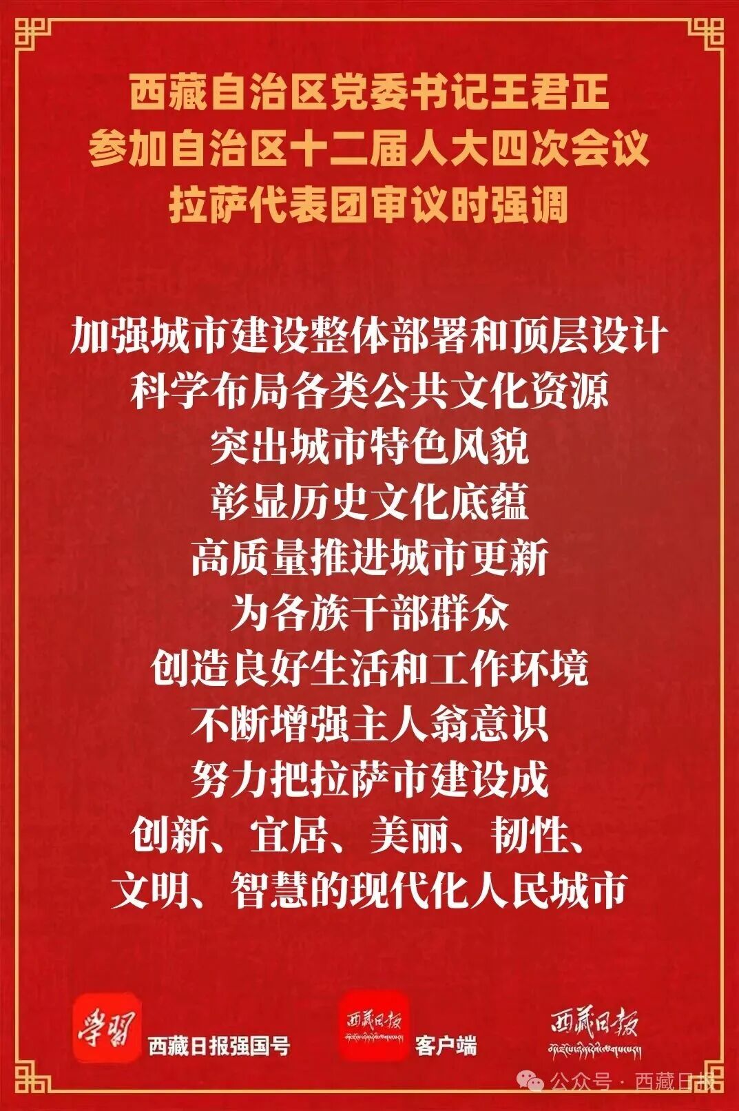 王君正強調(diào),要堅持統(tǒng)籌兼顧,推動“四件大事”落實落地,確?!笆逦濉遍_好局起好步。鞏固團結(jié)穩(wěn)定的政治和社會局面,貫徹落實習近平法治思想,樹牢總體國家安全觀,堅持把維護穩(wěn)定作為第一位的政治任務(wù)常抓不懈,警鐘長鳴、警惕常在,深入開展反分裂斗爭,進一步提升社會治理效能,扎實推進中華民族共同體建設(shè),加強宗教事務(wù)治理法治化,深入開展“三個意識”教育,積極引導(dǎo)藏傳佛教與社會主義社會相適應(yīng),為長治久安打下堅實基礎(chǔ),讓拉薩更加和諧穩(wěn)定。因地制宜推動高質(zhì)量發(fā)展,完整準確全面貫徹新發(fā)展理念,積極擴大有效投資,加快重大項目建設(shè),以項目的點帶動產(chǎn)業(yè)的線、壯大經(jīng)濟的面,大力發(fā)展特色優(yōu)勢產(chǎn)業(yè),培育壯大新興產(chǎn)業(yè),因地制宜發(fā)展新質(zhì)生產(chǎn)力,加快建設(shè)現(xiàn)代化產(chǎn)業(yè)體系,持續(xù)優(yōu)化營商環(huán)境,加大招商引資力度,激發(fā)民間投資活力,深挖消費市場潛力,實施提振消費專項行動,著力打造消費新場景,拉動消費新需求,確保經(jīng)濟發(fā)展當前有活力、未來有潛力。持續(xù)保障和改善民生,堅持以人民為中心的發(fā)展思想,精心辦好民生實事,統(tǒng)籌做好就業(yè)、教育、醫(yī)療、社保等各項工作,扎實推進鄉(xiāng)村全面振興,加快推進農(nóng)業(yè)農(nóng)村現(xiàn)代化,堅持走好新時代黨的群眾路線,深入基層面對面聽取群眾意見建議,用心用情解決群眾急難愁盼問題,不斷增強各族群眾獲得感幸福感安全感。持續(xù)推進現(xiàn)代化人民城市建設(shè),認真踐行人民城市理念,把人民放在城市建設(shè)的主體地位,更加注重以人為本,轉(zhuǎn)變城市發(fā)展理念,推進科學性規(guī)劃和現(xiàn)代化治理,加強城市建設(shè)整體部署和頂層設(shè)計,科學布局各類公共文化資源,突出城市特色風貌,彰顯歷史文化底蘊,高質(zhì)量推進城市更新,為各族干部群眾創(chuàng)造良好生活和工作環(huán)境,不斷增強主人翁意識,努力把拉薩市建設(shè)成創(chuàng)新、宜居、美麗、韌性、文明、智慧的現(xiàn)代化人民城市。著力建設(shè)人與自然和諧共生的美麗家園,深入貫徹落實習近平生態(tài)文明思想,加快經(jīng)濟社會發(fā)展綠色轉(zhuǎn)型,全面推進生態(tài)保護修復(fù),堅決打好污染防治攻堅戰(zhàn),扎實推進城鄉(xiāng)環(huán)境綜合整治,大力實施國土綠化行動,科學推進南北山綠化工程,持續(xù)做好城市園林綠化工作,確?!拔迥暝鼍G山川、十年綠滿拉薩”。努力建設(shè)強邊大后方,從政治和全局的高度,深刻把握在強邊固防中的職責使命,加強服務(wù)保障能力建設(shè),深入開展宣傳教育,深化雙擁共建,切實筑牢國家安全屏障。