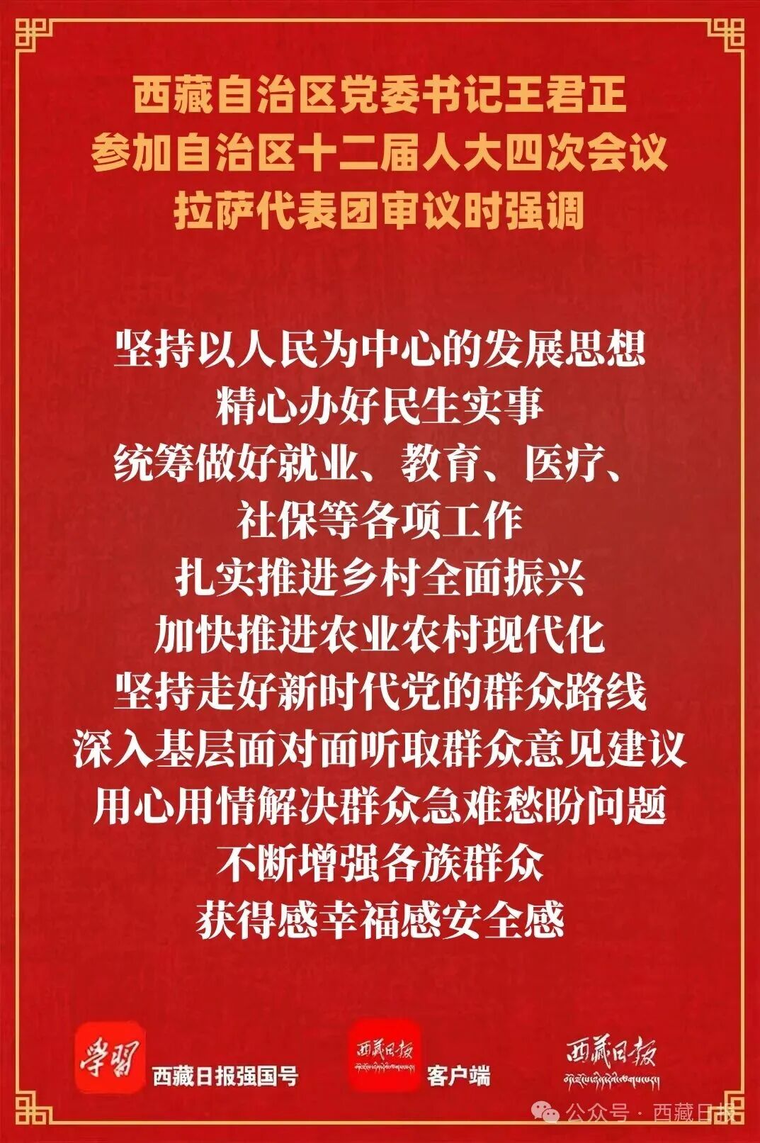 1月31日,自治區(qū)黨委書記王君正參加他所在的自治區(qū)十二屆人大四次會議拉薩代表團審議時強調(diào),要全面深刻準確貫徹落實黨的二十屆四中全會精神,深入貫徹習近平總書記關(guān)于西藏工作的重要指示和新時代黨的治藏方略,為“十五五”開好局起好步當好全區(qū)長治久安和高質(zhì)量發(fā)展排頭兵,努力為社會主義現(xiàn)代化新西藏建設(shè)作出更大貢獻。