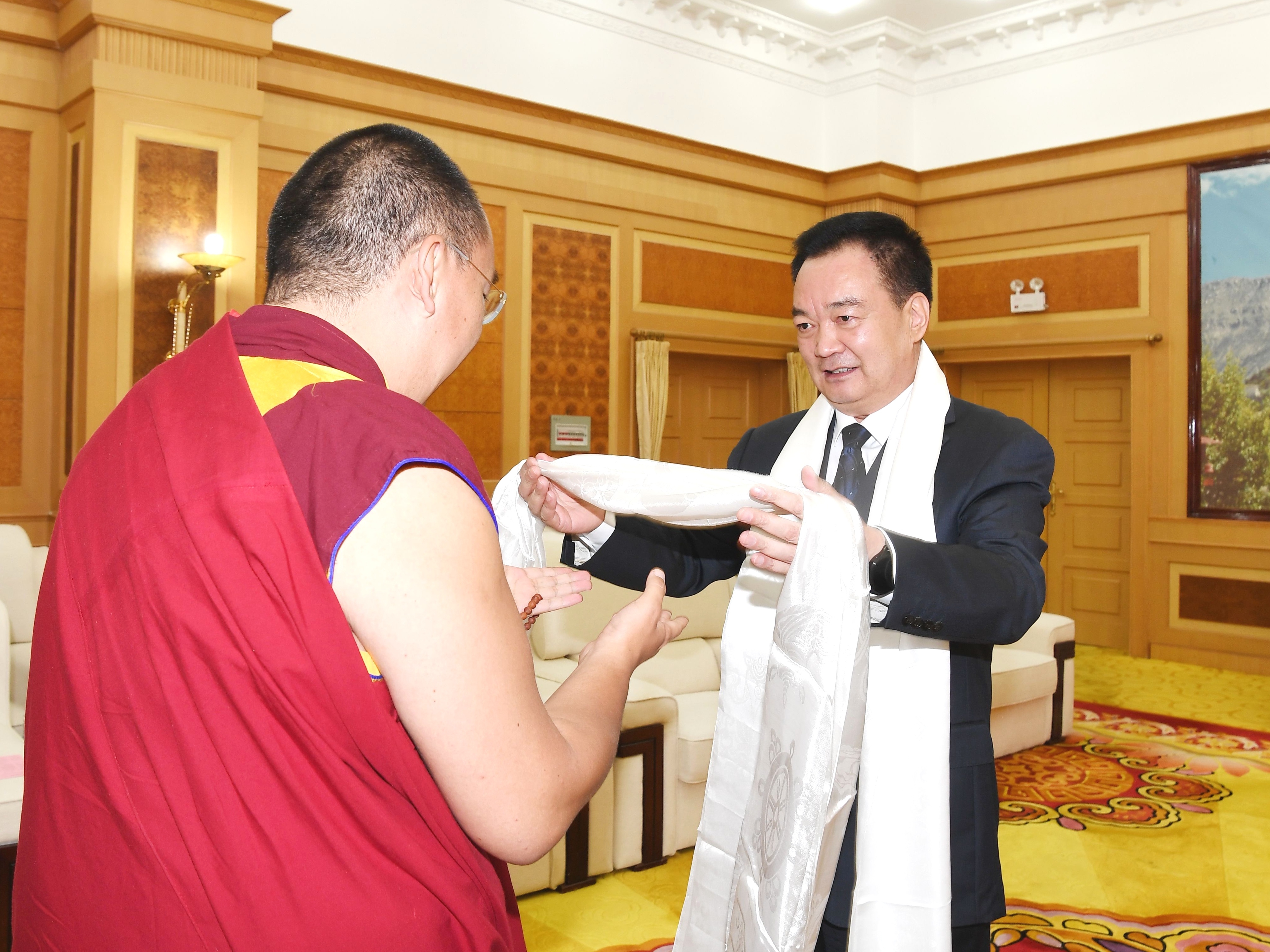 6月19日,自治區黨委書記王君正在拉薩會見班禪額爾德尼·確吉杰布。這是王君正與班禪額爾德尼·確吉杰布互獻哈達。記者 李洲 攝
