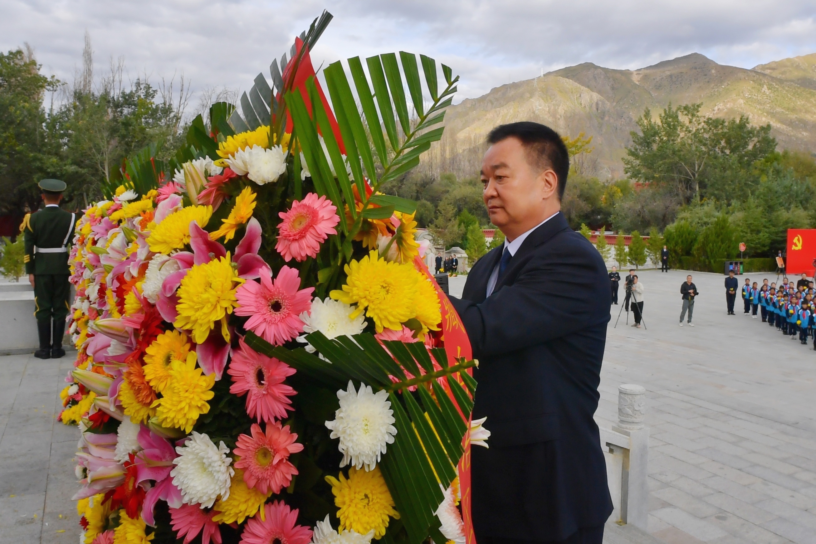 9月30日上午,西藏自治區舉行烈士紀念日向革命烈士敬獻花籃儀式。這是王君正整理花籃上的緞帶。本網記者 旦增西旦 攝