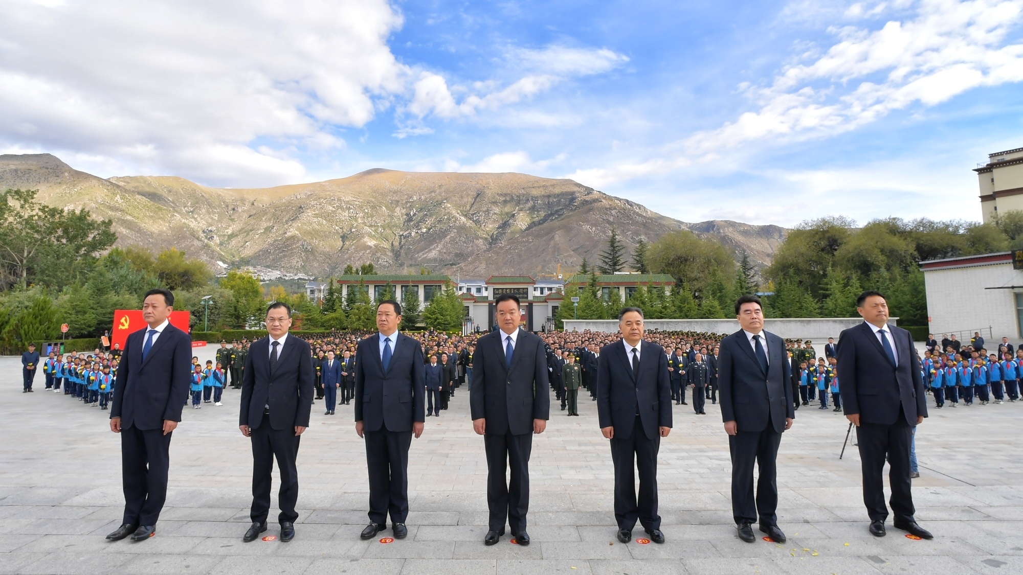 拉薩烈士陵園,青松挺立、莊嚴肅穆,革命烈士紀念碑巍峨矗立。9時30分許,自治區領導和各族各界干部群眾代表步行來到紀念碑前,靜默肅立。伴隨著雄渾高亢的《義勇軍進行曲》,全場齊聲高唱中華人民共和國國歌。國歌唱畢,全場肅立,向為西藏和平解放、民主改革和社會主義現代化建設事業英勇犧牲的先烈們默哀。默哀畢,少先隊員獻唱《我們是共產主義接班人》,向革命烈士致敬。