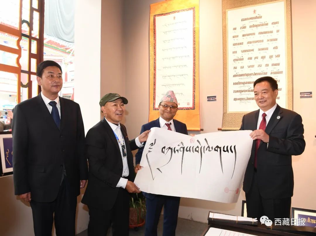 這是中國西藏旅游文化國際博覽會期間,王君正向尼泊爾聯邦院主席加內什·普拉薩德·蒂米爾西納贈送藏文書法作品。記者 李洲 攝