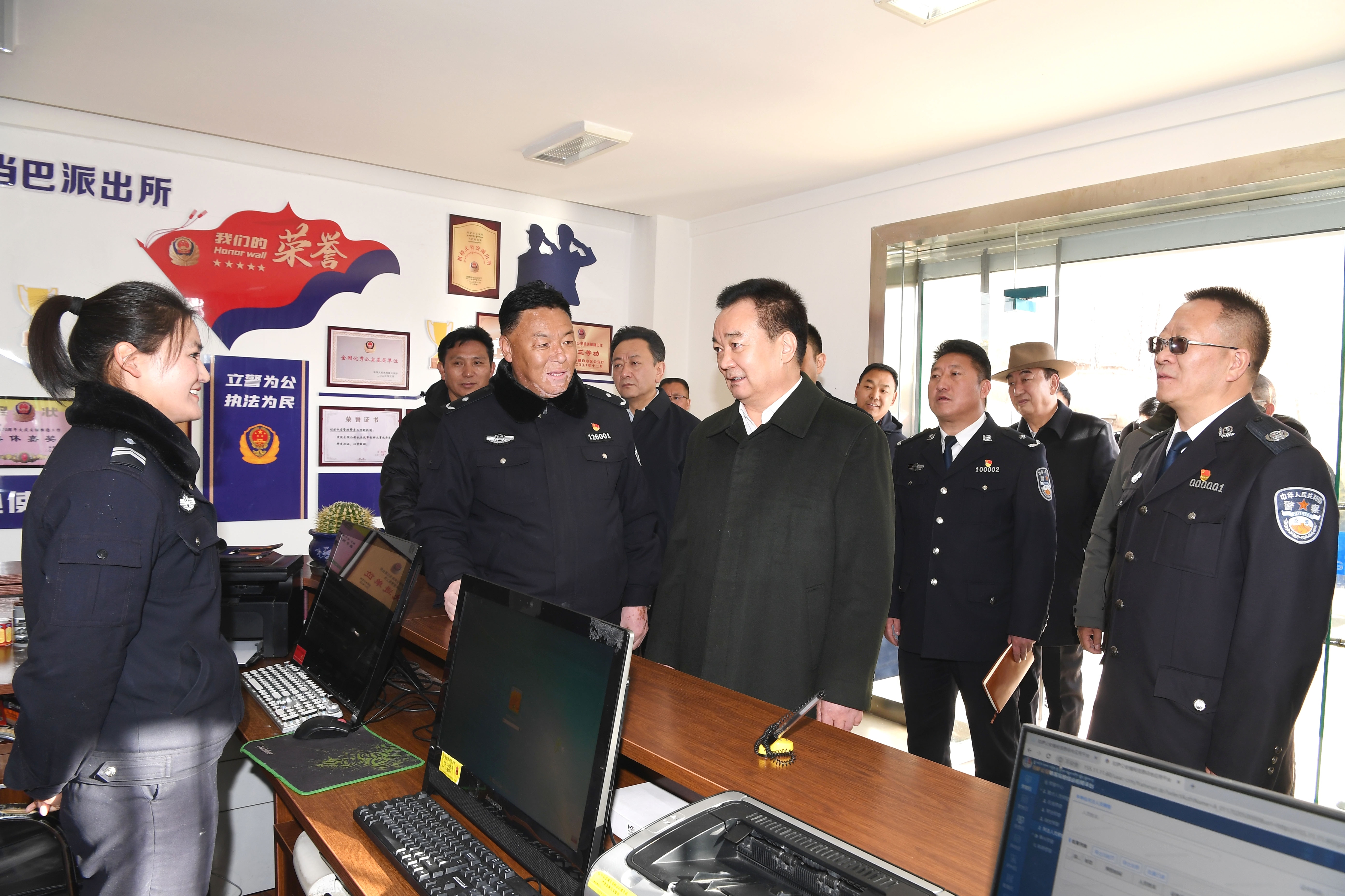春節(jié)、藏歷新年期間,自治區(qū)黨委書記王君正看望慰問基層一線干部群眾。這是王君正在當(dāng)巴派出所辦證大廳,親切看望慰問堅守崗位的公安民輔警。記者 李洲 攝
