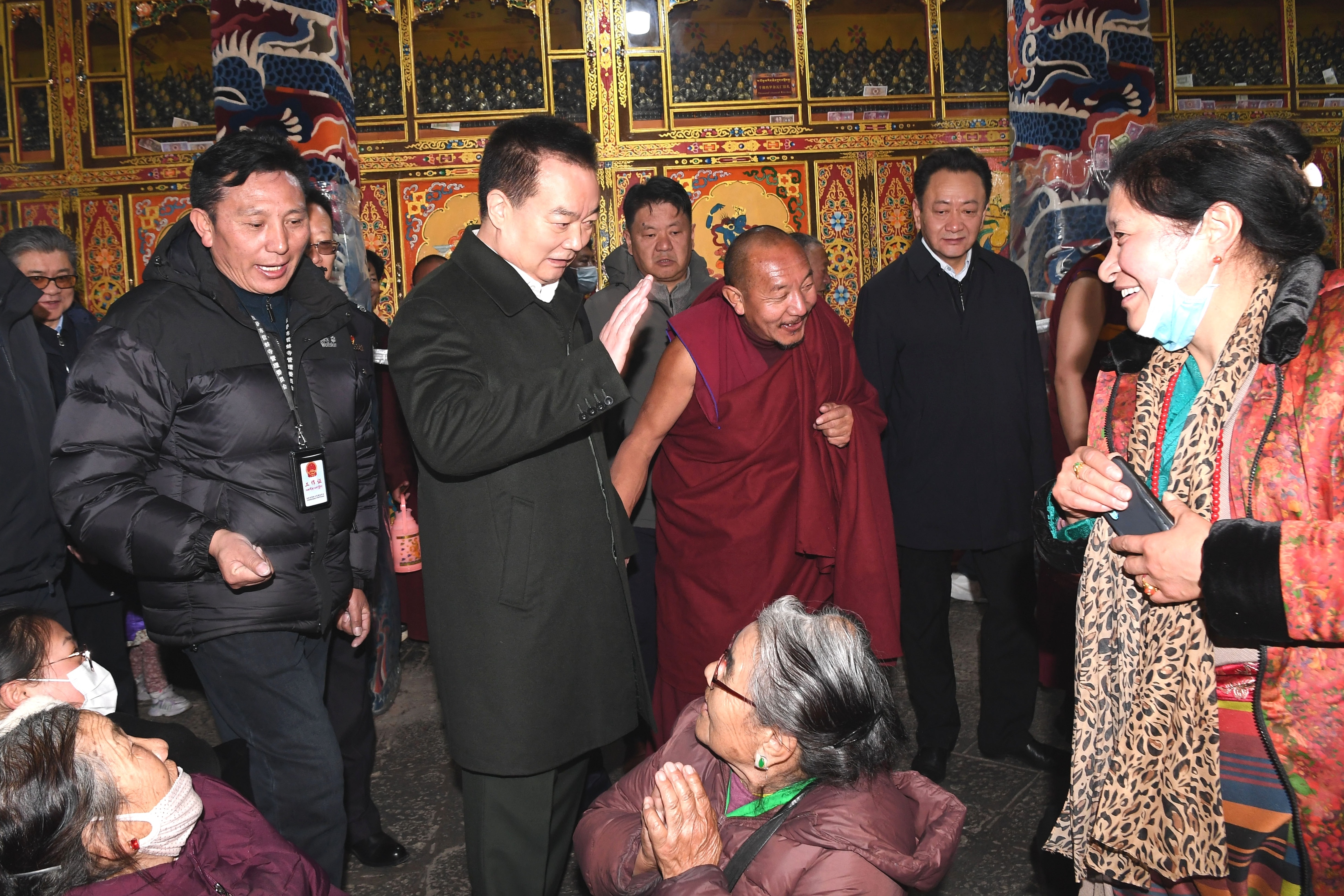 春節(jié)、藏歷新年期間,自治區(qū)黨委書記王君正看望慰問基層一線干部群眾。這是王君正在哲蚌寺與群眾和游客親切攀談、向他們揮手致意,祝愿他們在新的一年生活越來越美滿、日子越過越紅火。記者 李洲 攝