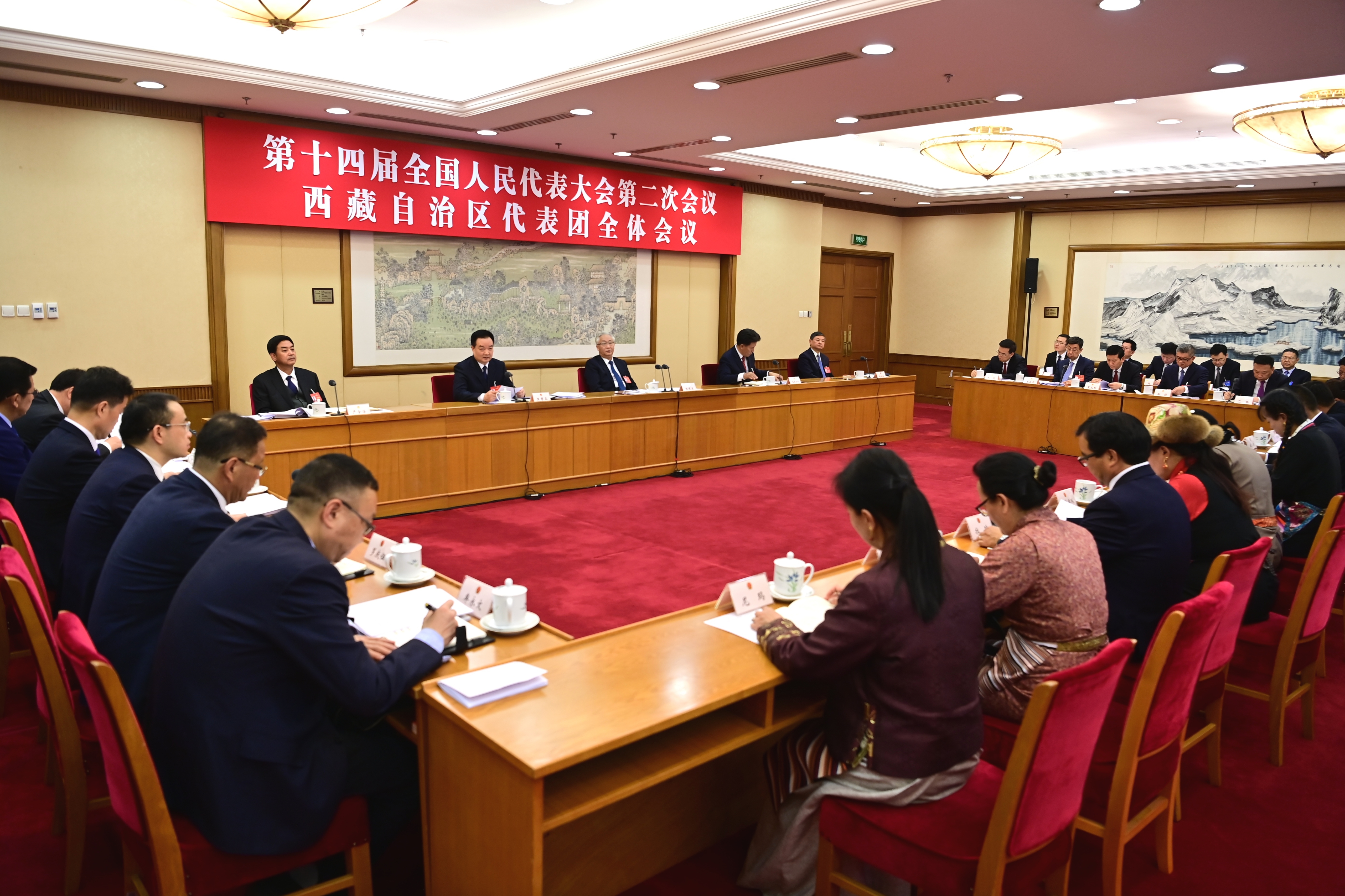 3月5日下午,十四屆全國人大二次會議西藏代表團舉行全體會議,審議政府工作報告。這是會議現場。記者 旦增西旦 攝