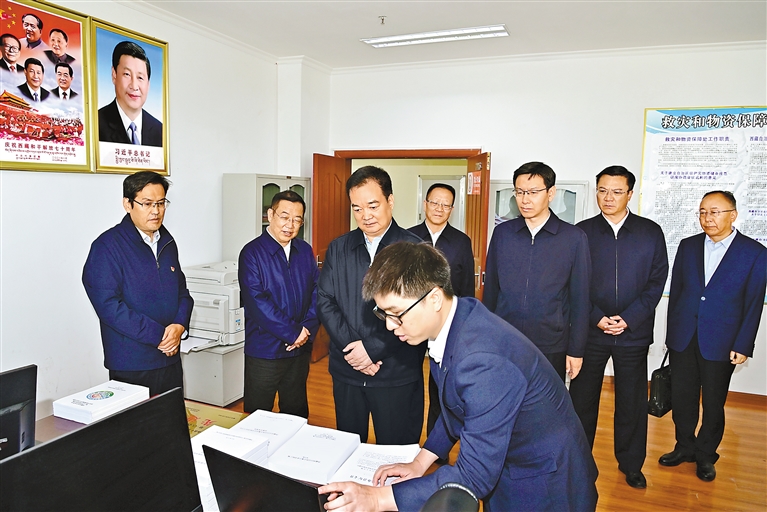 7月29日上午,自治區黨委書記王君正到應急管理系統調研。這是在自治區應急管理廳綜合減災救災和物資保障處,王君正了解相關工作情況。記者 旦增西旦 攝