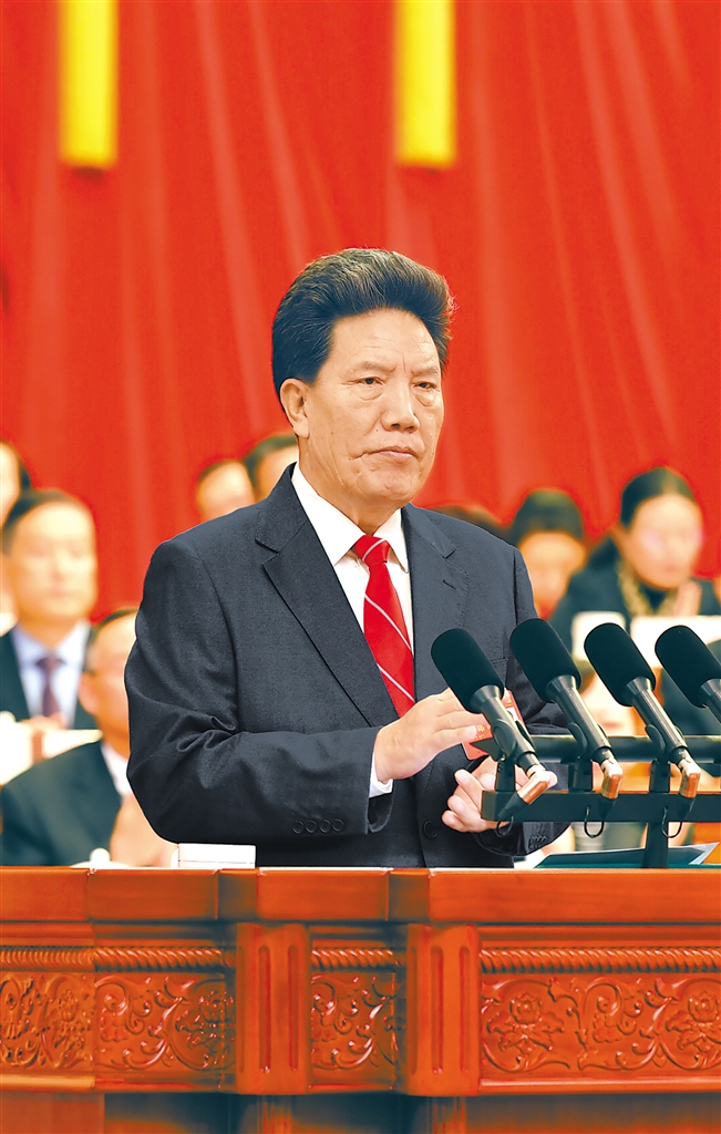 全國人大常委會副委員長、自治區人大常委會主任洛桑江村向大會作自治區人大常委會工作報告。本報記者 次仁平措 攝