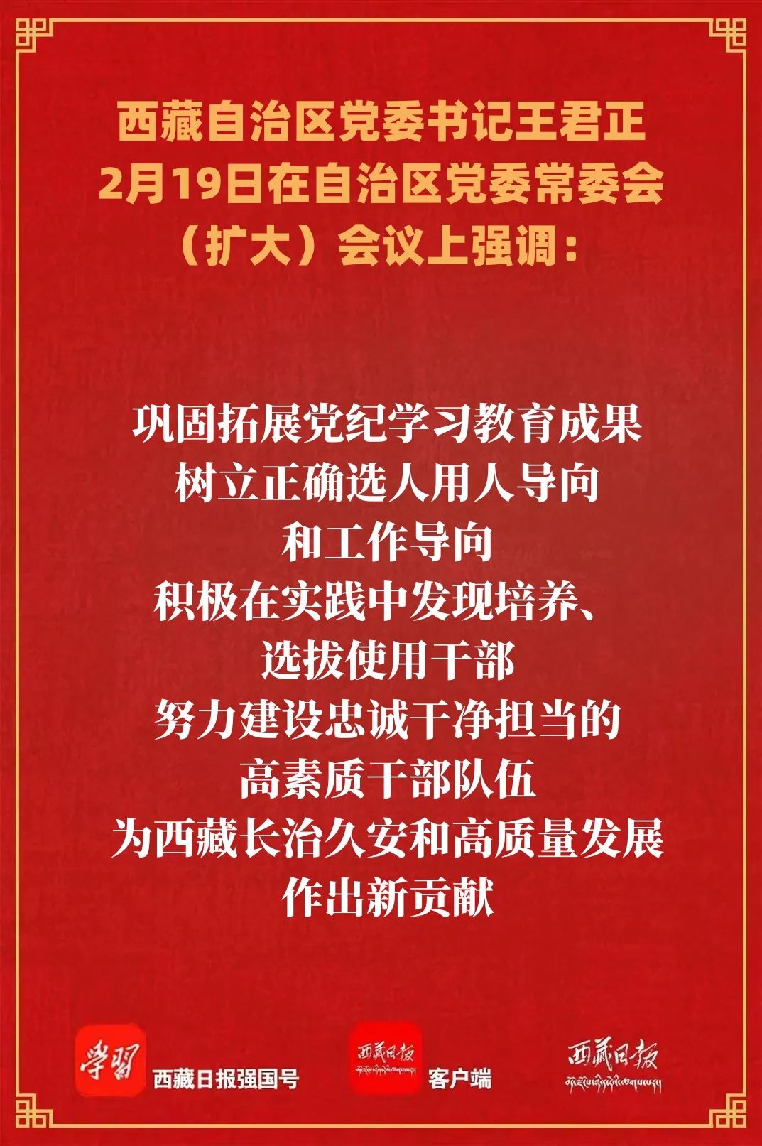 王君正強調,各級黨委要把黨的領導落實到經濟社會發展全過程各方面,確保黨中央決策部署和自治區黨委工作要求落實落地。鞏固拓展黨紀學習教育成果,樹立正確選人用人導向和工作導向,積極在實踐中發現培養、選拔使用干部,努力建設忠誠干凈擔當的高素質干部隊伍,為西藏長治久安和高質量發展作出新貢獻。