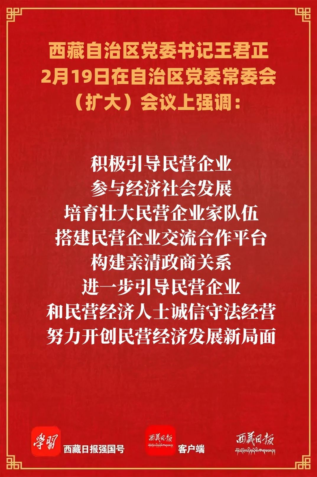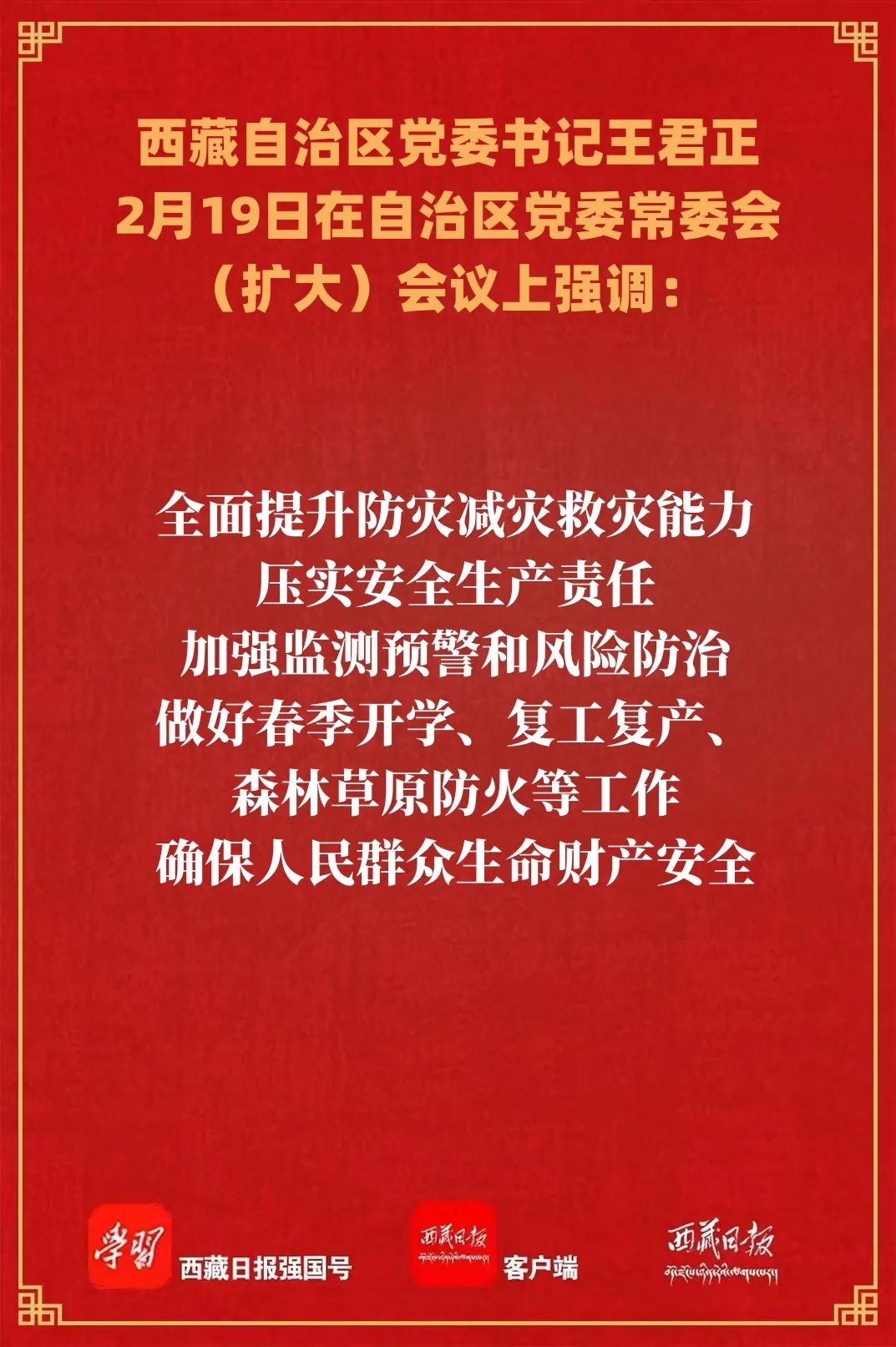 王君正強調,要弘揚理論聯系實際的學風,堅持不懈用習近平總書記重要指示精神統攬西藏工作全局,圍繞“四件大事”落實,努力推動長治久安和高質量發展。統籌好發展和安全,樹牢總體國家安全觀,堅持警鐘長鳴、警惕常在,扎扎實實做好各項工作,特別是全國兩會、藏歷新年期間維穩措施落實,確保社會大局和諧穩定。強化創新驅動和產業支撐,加快推動科技成果向現實生產力轉化,努力培育壯大新興產業,形成主體功能明顯、優勢互補、高質量發展的區域發展新局面。全面深化改革,緊盯制約長治久安和高質量發展的堵點卡點、民生領域的難點痛點問題,持續推動重點領域改革任務落實,不斷提升對外開放水平,進一步激發動力和活力。加快推進農業農村現代化,堅決守住耕地保護紅線和糧食安全底線,做大做強鄉村特色產業,促進城鄉共同繁榮、鄉村全面振興。更好促進民營經濟健康發展,貫徹“兩個毫不動搖”“三個沒有變”的方針,強化全局意識、系統觀念、法治精神,扎實落實促進民營經濟發展的政策措施,積極引導民營企業參與經濟社會發展,培育壯大民營企業家隊伍,搭建民營企業交流合作平臺,構建親清政商關系,進一步引導民營企業和民營經濟人士誠信守法經營,努力開創民營經濟發展新局面。積極推動體育事業發展,一體推進競技體育和群眾性體育全面發展,多措并舉讓各種體育資源“活”起來。全面提升防災減災救災能力,壓實安全生產責任,加強監測預警和風險防治,做好春季開學、復工復產、森林草原防火等工作,確保人民群眾生命財產安全。