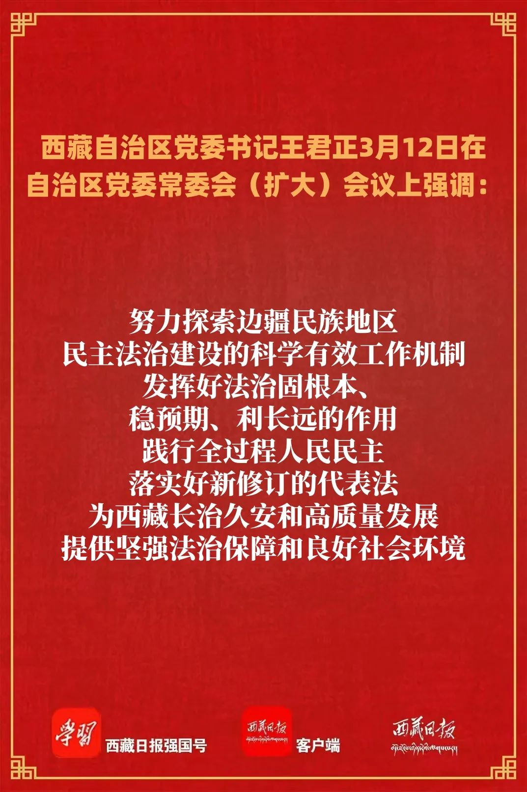 王君正強(qiáng)調(diào),全區(qū)各級(jí)各部門和廣大黨員干部要深入學(xué)習(xí)貫徹習(xí)近平總書記重要講話精神,努力掌握蘊(yùn)含其中的科學(xué)世界觀、方法論,切實(shí)用以武裝頭腦、指導(dǎo)實(shí)踐、推動(dòng)工作,確保在思想上政治上行動(dòng)上同以習(xí)近平同志為核心的黨中央保持高度一致。要深刻把握黨和國(guó)家事業(yè)發(fā)展取得的成就,進(jìn)一步堅(jiān)定發(fā)展信心。深刻認(rèn)識(shí)“兩個(gè)確立”是黨和國(guó)家事業(yè)不斷取得進(jìn)步的決定性因素,是我們戰(zhàn)勝一切艱難險(xiǎn)阻、應(yīng)對(duì)一切不確定性的最大確定性、最大底氣、最大保證,堅(jiān)定不移沿著習(xí)近平總書記指引的方向前進(jìn),堅(jiān)決貫徹落實(shí)黨中央決策部署,以實(shí)際行動(dòng)把“兩個(gè)維護(hù)”落實(shí)好,不斷開創(chuàng)中國(guó)特色社會(huì)主義事業(yè)新局面。要深刻把握2025年經(jīng)濟(jì)社會(huì)發(fā)展總體目標(biāo)、政策取向和重點(diǎn)工作任務(wù),把準(zhǔn)正確發(fā)展方向。把思想和行動(dòng)統(tǒng)一到黨中央對(duì)形勢(shì)的科學(xué)判斷上來,自覺把西藏工作置于黨和國(guó)家工作大局中思考、謀劃、推動(dòng),細(xì)化研究政府工作報(bào)告明確的“十個(gè)方面”重點(diǎn)任務(wù),轉(zhuǎn)化為推動(dòng)西藏各項(xiàng)事業(yè)發(fā)展的具體舉措,積極研究新情況、主動(dòng)解決新問題,努力探索新形勢(shì)下科學(xué)有效的工作機(jī)制,確保黨中央決策部署在雪域高原落地生根、開花結(jié)果。要深刻把握中國(guó)特色社會(huì)主義民主法治建設(shè)的新部署新要求,為長(zhǎng)治久安打下堅(jiān)實(shí)基礎(chǔ)。努力探索邊疆民族地區(qū)民主法治建設(shè)的科學(xué)有效工作機(jī)制,發(fā)揮好法治固根本、穩(wěn)預(yù)期、利長(zhǎng)遠(yuǎn)的作用,踐行全過程人民民主,落實(shí)好新修訂的代表法,為西藏長(zhǎng)治久安和高質(zhì)量發(fā)展提供堅(jiān)強(qiáng)法治保障和良好社會(huì)環(huán)境。