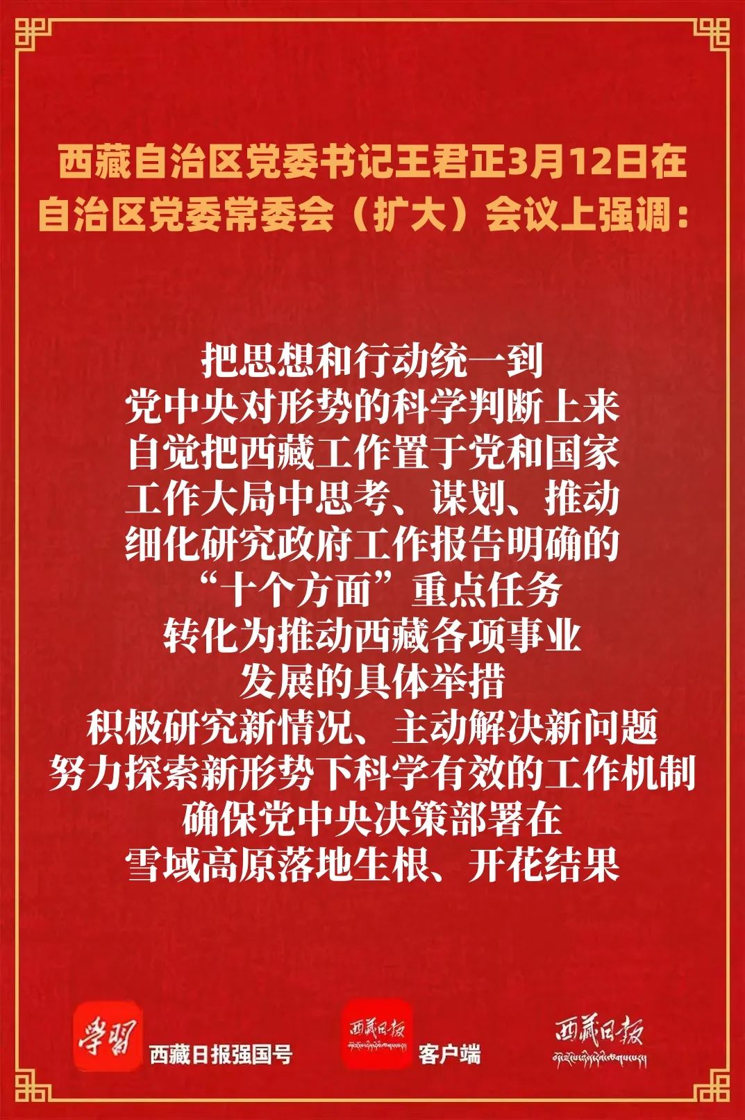 王君正強(qiáng)調(diào),要弘揚(yáng)理論聯(lián)系實(shí)際的學(xué)風(fēng),緊密結(jié)合實(shí)際抓好全國(guó)兩會(huì)精神貫徹落實(shí),努力建設(shè)社會(huì)主義現(xiàn)代化新西藏。把貫徹落實(shí)全國(guó)兩會(huì)精神與貫徹落實(shí)習(xí)近平總書記關(guān)于西藏工作的重要指示和新時(shí)代黨的治藏方略結(jié)合起來,持之以恒抓好“穩(wěn)定、發(fā)展、生態(tài)、強(qiáng)邊”四件大事落實(shí),堅(jiān)決維護(hù)社會(huì)大局持續(xù)穩(wěn)定,堅(jiān)持全面依法治藏,以科學(xué)化機(jī)制和常態(tài)化、法治化理念,把維穩(wěn)工作做在日常、做到經(jīng)常、落實(shí)到基層,推進(jìn)中華民族共同體建設(shè),深化拓展“國(guó)家意識(shí)、公民意識(shí)、法治意識(shí)”教育,推進(jìn)藏傳佛教中國(guó)化,不斷打牢長(zhǎng)治久安的基礎(chǔ);努力推動(dòng)西藏經(jīng)濟(jì)社會(huì)高質(zhì)量發(fā)展,因地制宜發(fā)展新質(zhì)生產(chǎn)力,培育壯大清潔能源、低空經(jīng)濟(jì)等戰(zhàn)略性新興產(chǎn)業(yè),加快構(gòu)建具有西藏特色的現(xiàn)代化產(chǎn)業(yè)體系,抓住新時(shí)代國(guó)家推進(jìn)西部大開發(fā)重大機(jī)遇,積極推進(jìn)西藏融入成渝地區(qū)雙城經(jīng)濟(jì)圈,確保經(jīng)濟(jì)發(fā)展當(dāng)前有活力、未來有潛力;不斷改善民生凝聚人心,堅(jiān)持以人民為中心的發(fā)展思想,把群眾身邊的小事當(dāng)作各級(jí)黨委、政府的大事來抓,鞏固拓展脫貧攻堅(jiān)成果,全面推進(jìn)鄉(xiāng)村振興,千方百計(jì)增加農(nóng)牧民群眾收入,解決好事關(guān)西藏經(jīng)濟(jì)社會(huì)高質(zhì)量發(fā)展的深層次問題,科學(xué)有序推進(jìn)定日地震災(zāi)后恢復(fù)重建,切實(shí)增強(qiáng)各族群眾的獲得感幸福感安全感;扎實(shí)筑牢國(guó)家生態(tài)安全屏障,嚴(yán)格落實(shí)青藏高原生態(tài)保護(hù)法,科學(xué)實(shí)施南北山綠化工程,加快建設(shè)美麗西藏;持續(xù)加強(qiáng)邊疆地區(qū)建設(shè),強(qiáng)化基本公共服務(wù),確保邊防鞏固、邊境安全、邊民幸福。